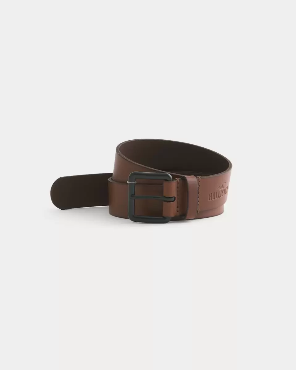 A classic genuine leather belt with a square metal buckle and embossed logo detail. Imported.