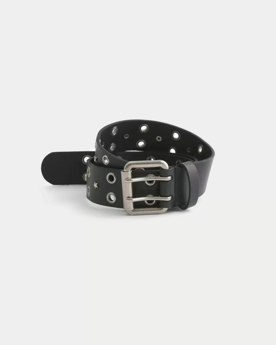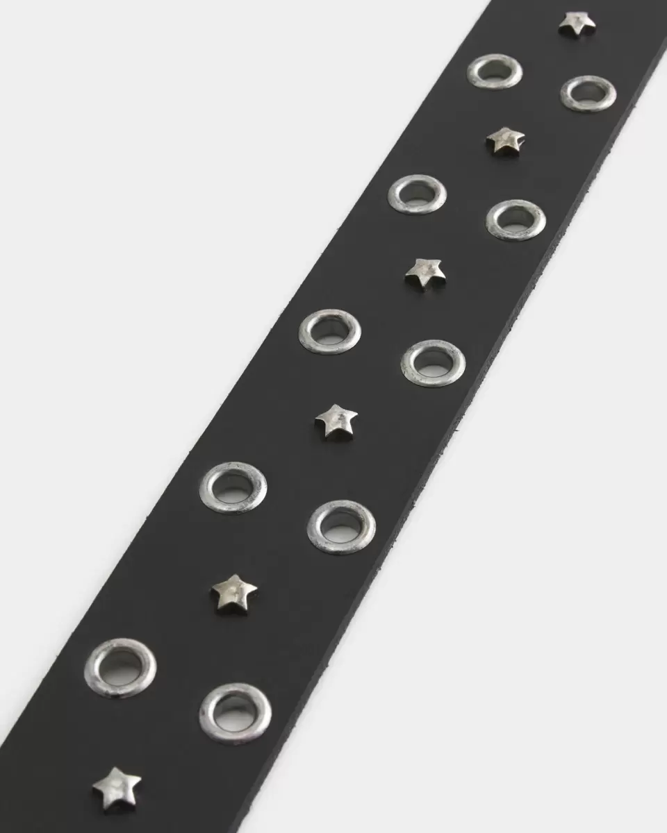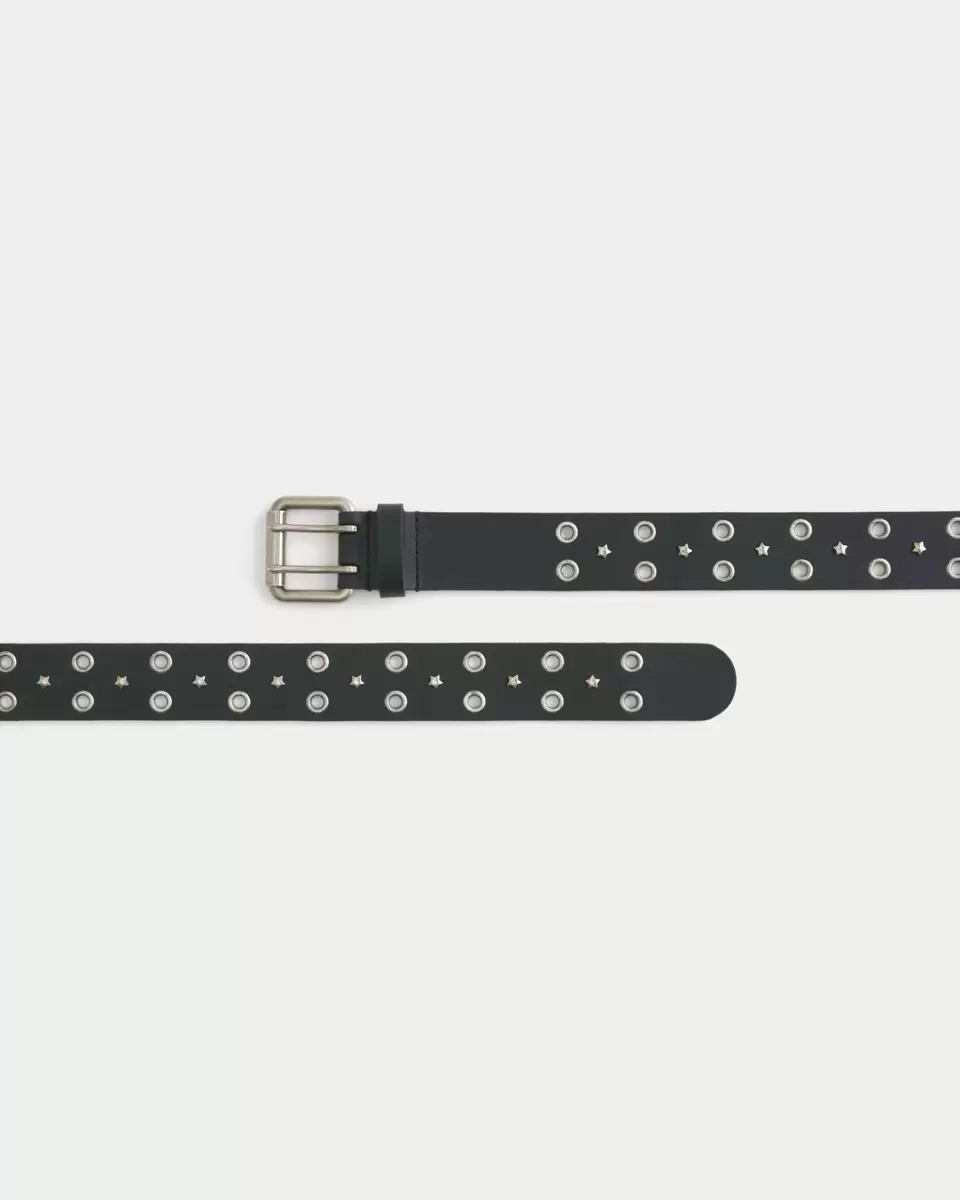 A classic leather belt with star stud details. Metal buckle. Imported.