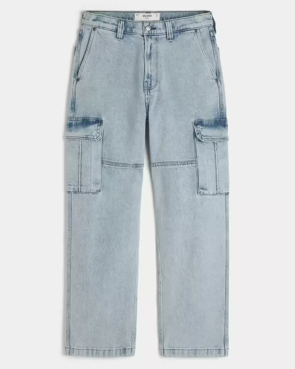 Comfortable denim jeans in a light wash, designed with a baggy leg. Side cargo pockets. Imported.