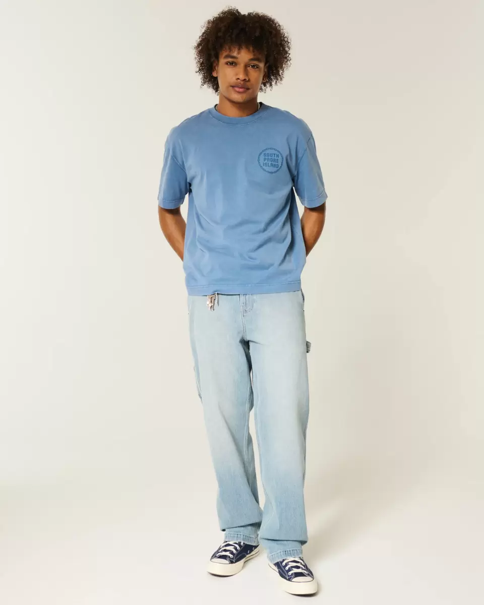 Comfortable denim painter jeans in a light wash, designed with a baggy leg. Fading, left loop detail with chain embroidery, extra pockets. Imported.
