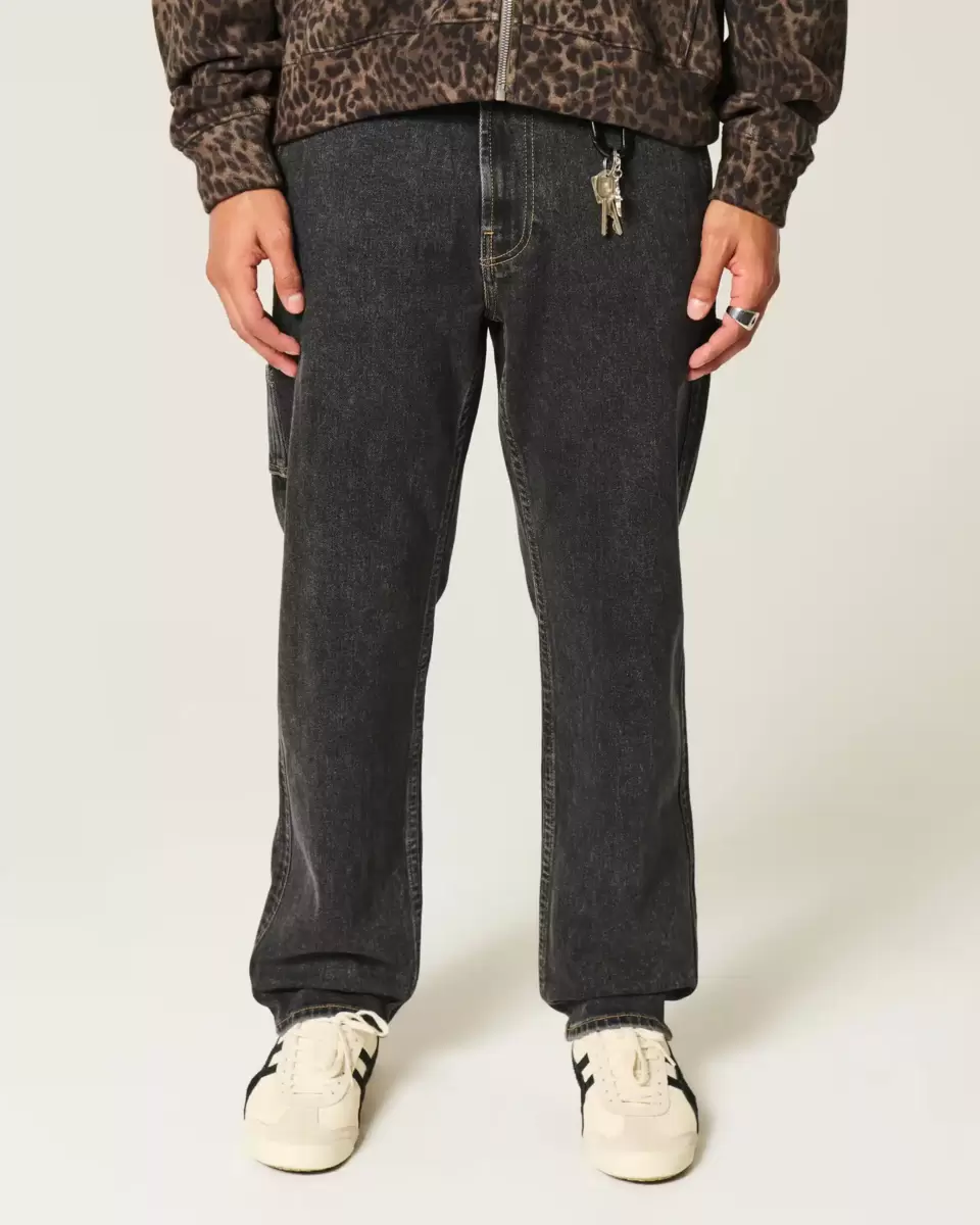 Comfortable denim jeans in washed black, designed with a loose leg, left painter loop detail and extra pockets. Imported.