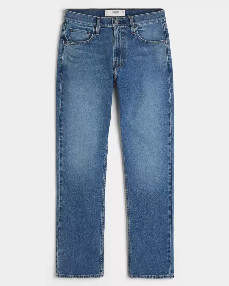 Comfortable Y2K-inspired denim jeans in a medium wash, designed with a slim straight leg. Fading, whiskering. Imported.