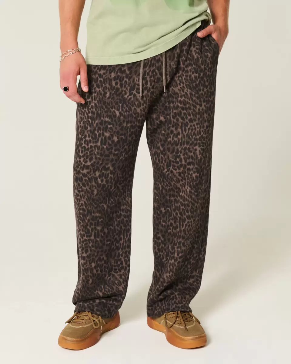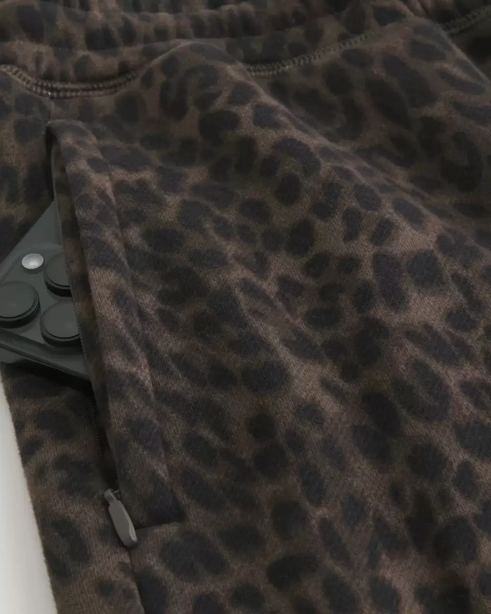 Super soft sweatpants designed with a baggy leg. Drawstring waist, pockets, right zipper pocket, all-over leopard print. Imported.