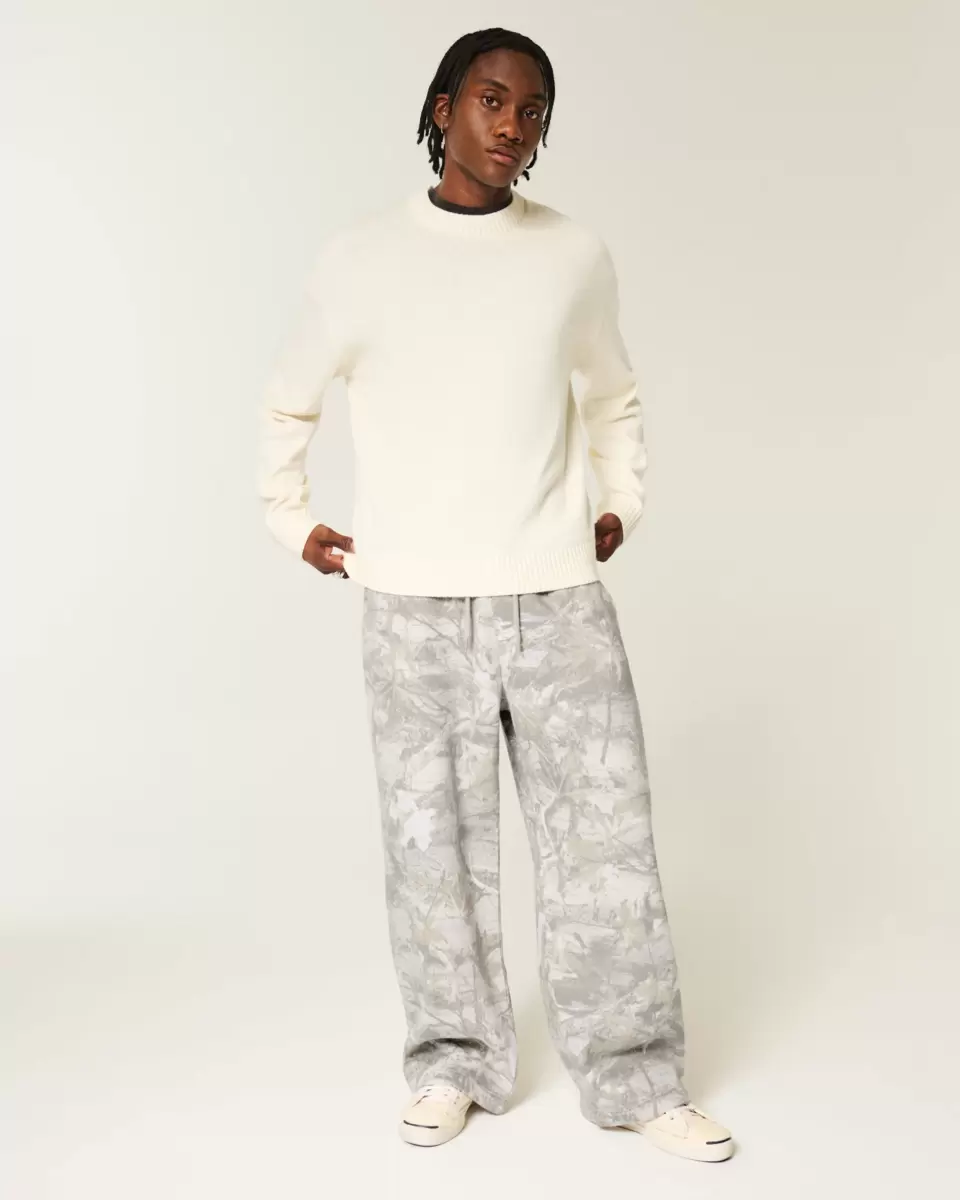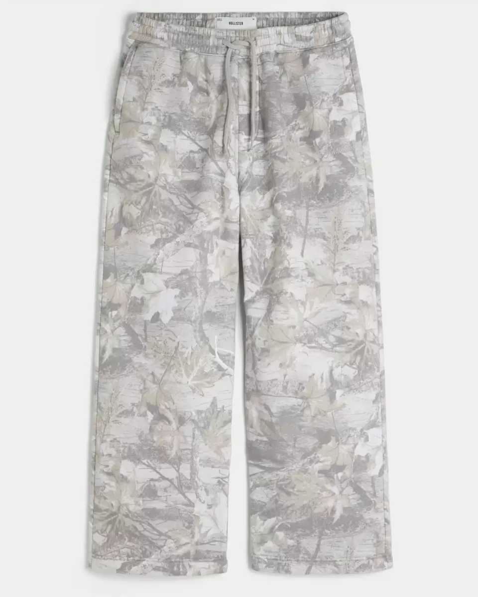 Comfortable fleece sweatpants with a super baggy leg and drawstring waist. Pockets, right zipper pocket, all-over camo pattern, embroidered logo detail.