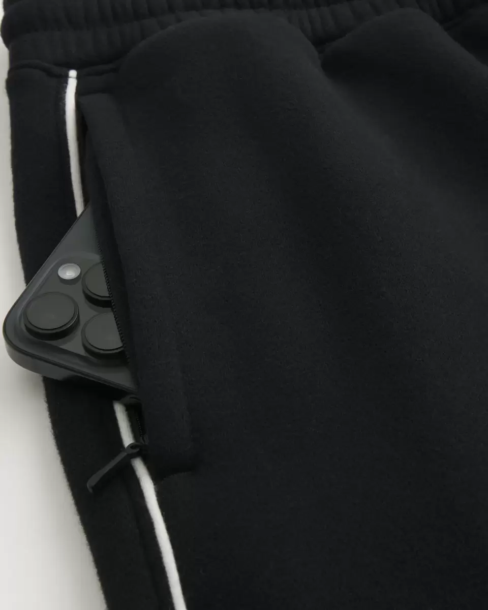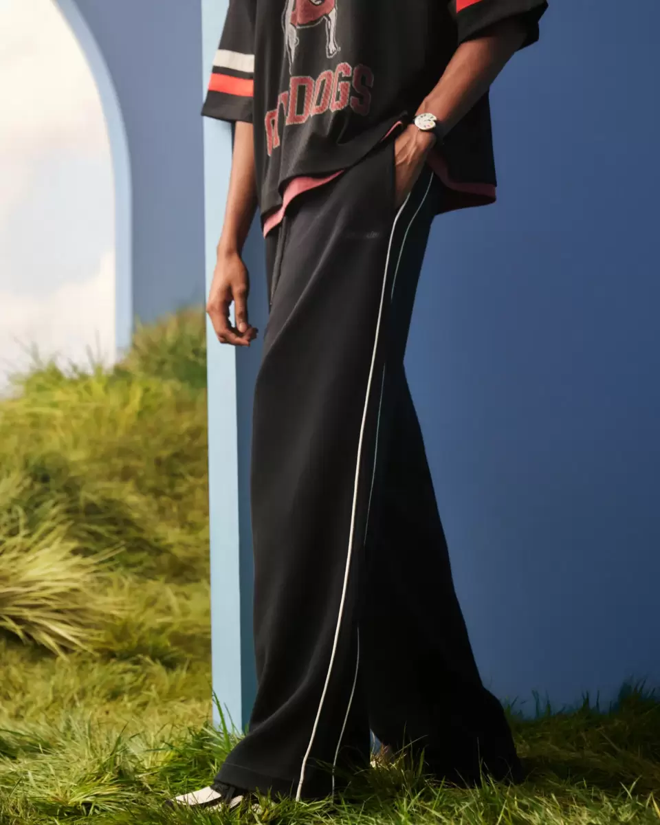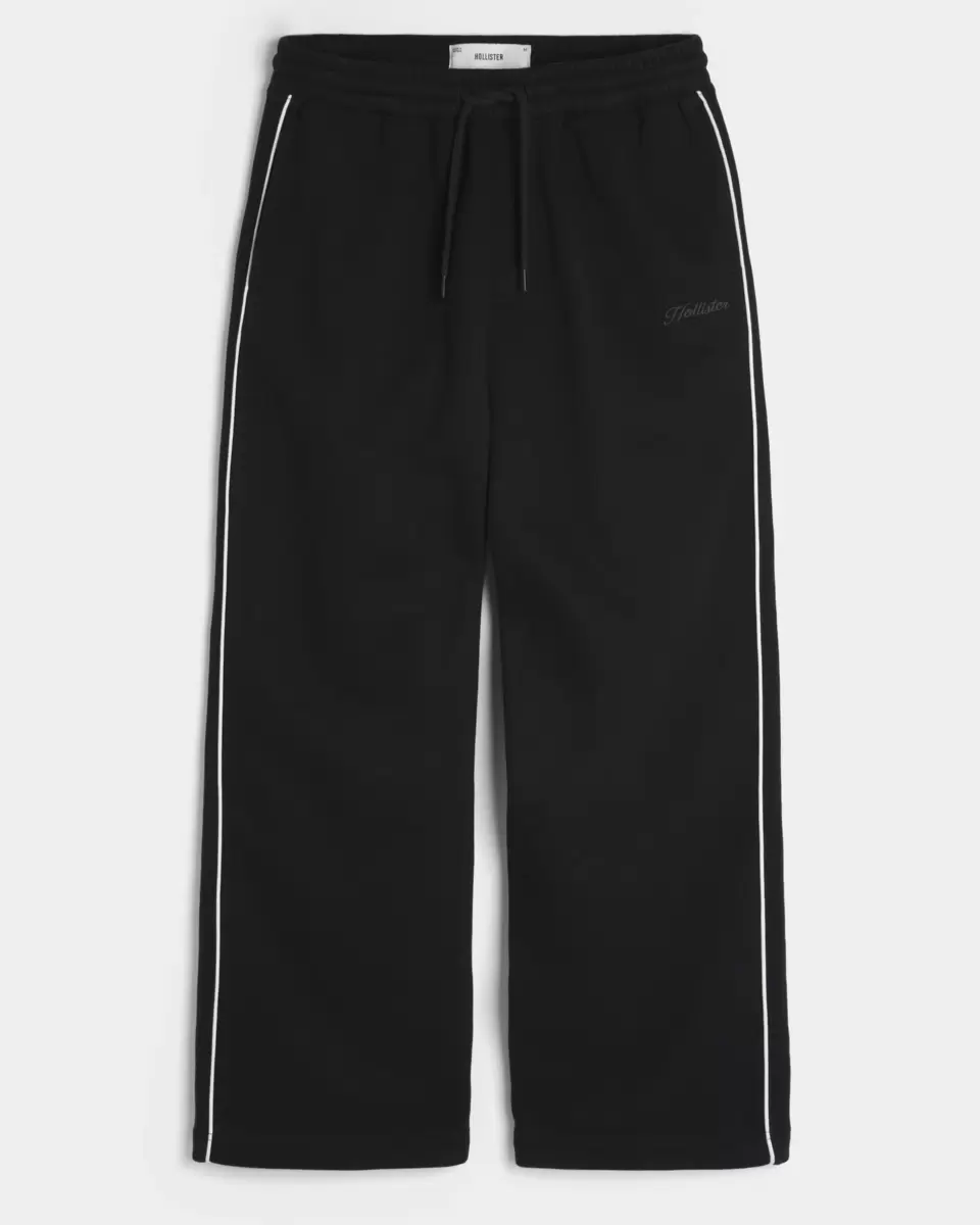 Soft fleece sweatpants designed with a super baggy leg and drawstring waist. Piping along the sides, embroidered logo detail, pockets, right zipper pocket.