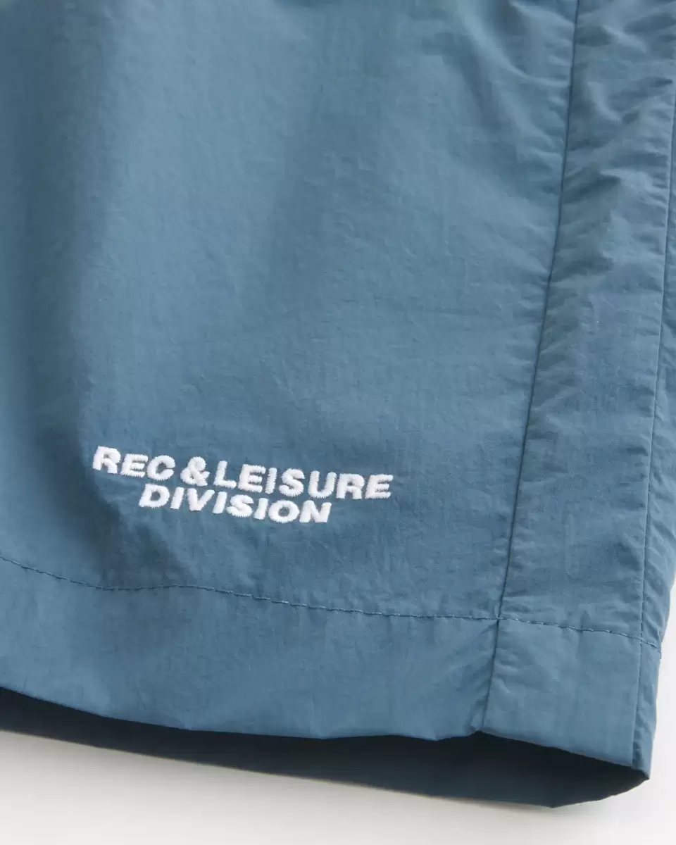 Ultra-comfortable track shorts in 100% nylon, designed with a drawstring waist and right zipper pocket. Embroidered Rec & Leisure Division detail at left leg. Hits above the knee. Imported.