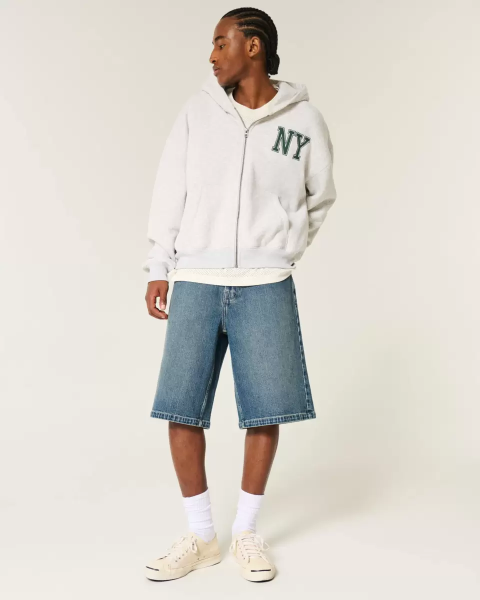 Comfortable denim shorts designed with a super baggy leg and below-the-knee length. Dark wash with fading. Imported.
