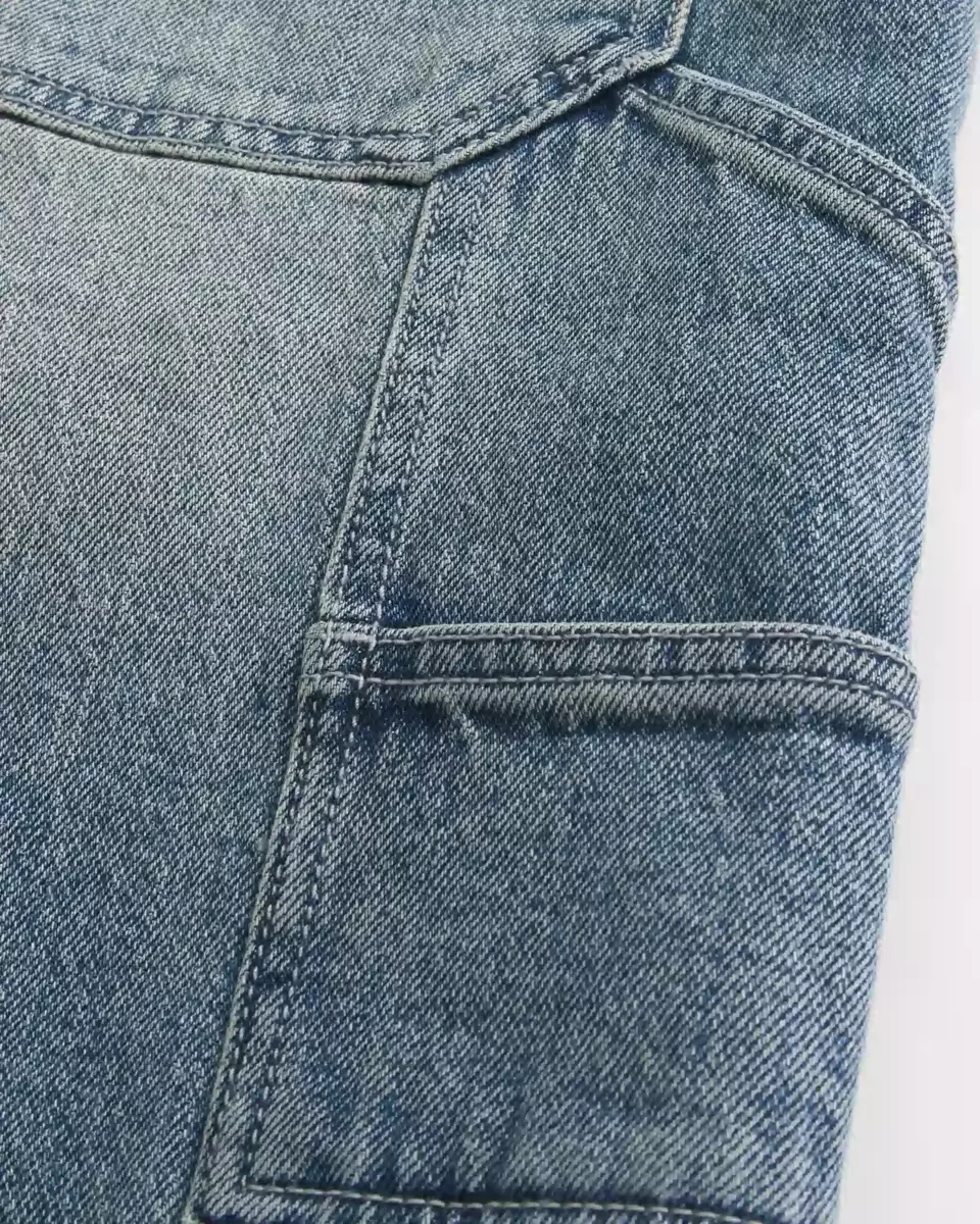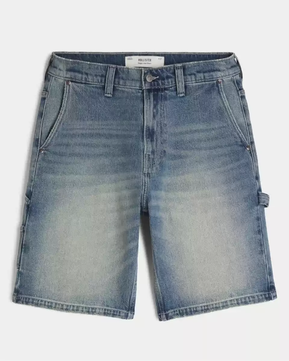 Classic painter-style denim shorts in a medium wash, designed with a baggy fit. Left loop detail, extra pockets, fading and whiskering. Hits at the knee. Imported.