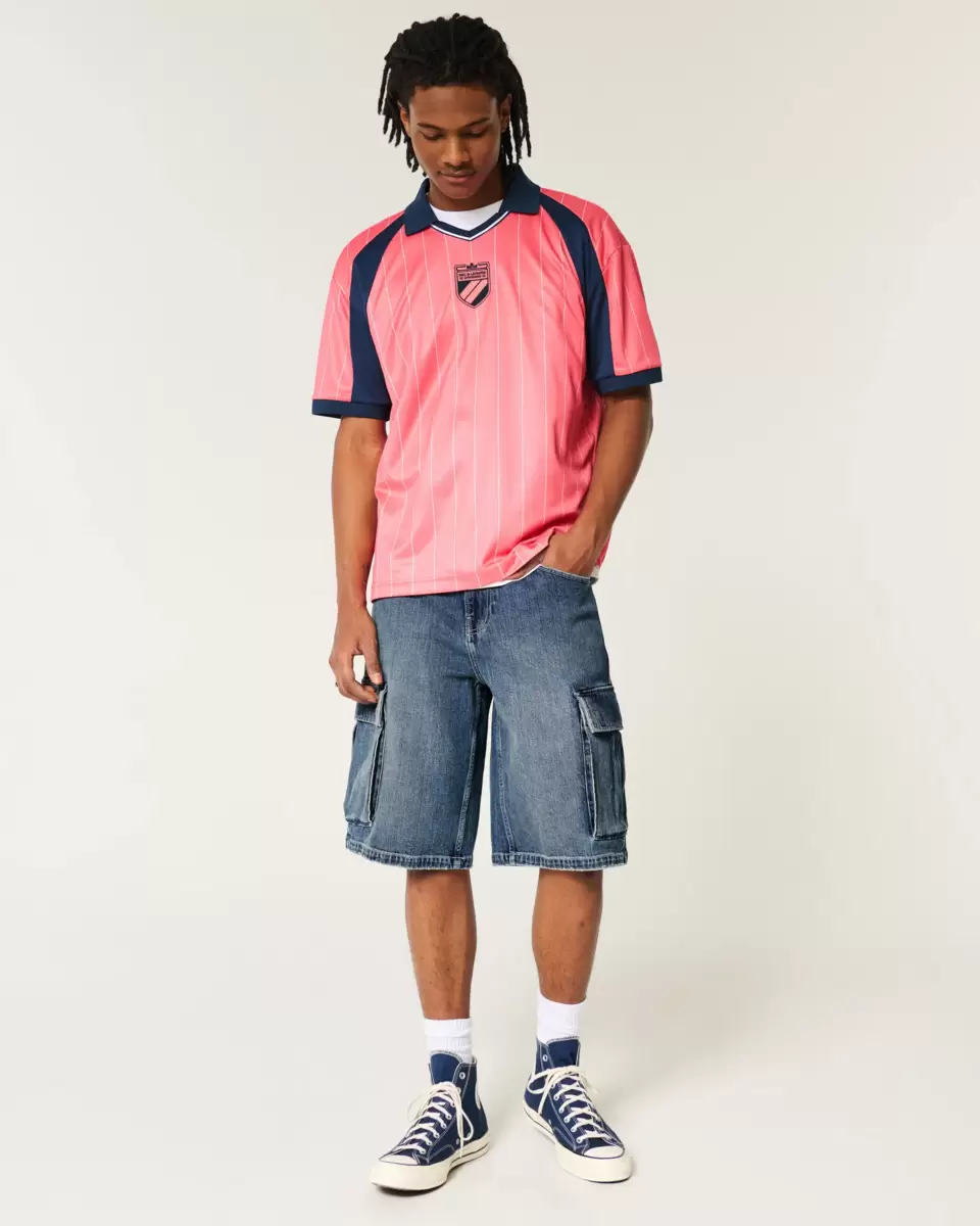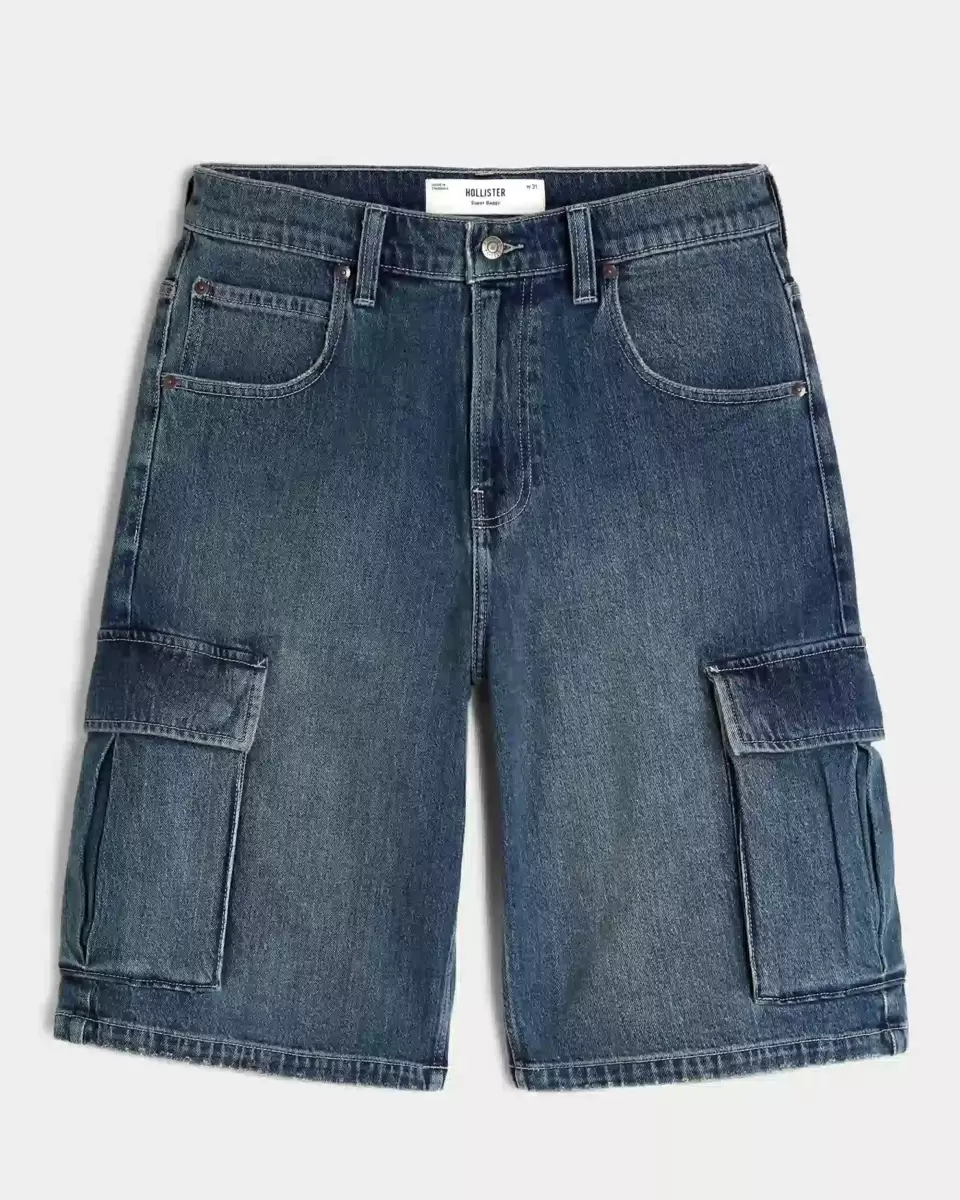 Ultra-comfortable denim shorts designed with a super baggy fit and side cargo pockets. Medium wash with fading. Hits below the knee. Imported.