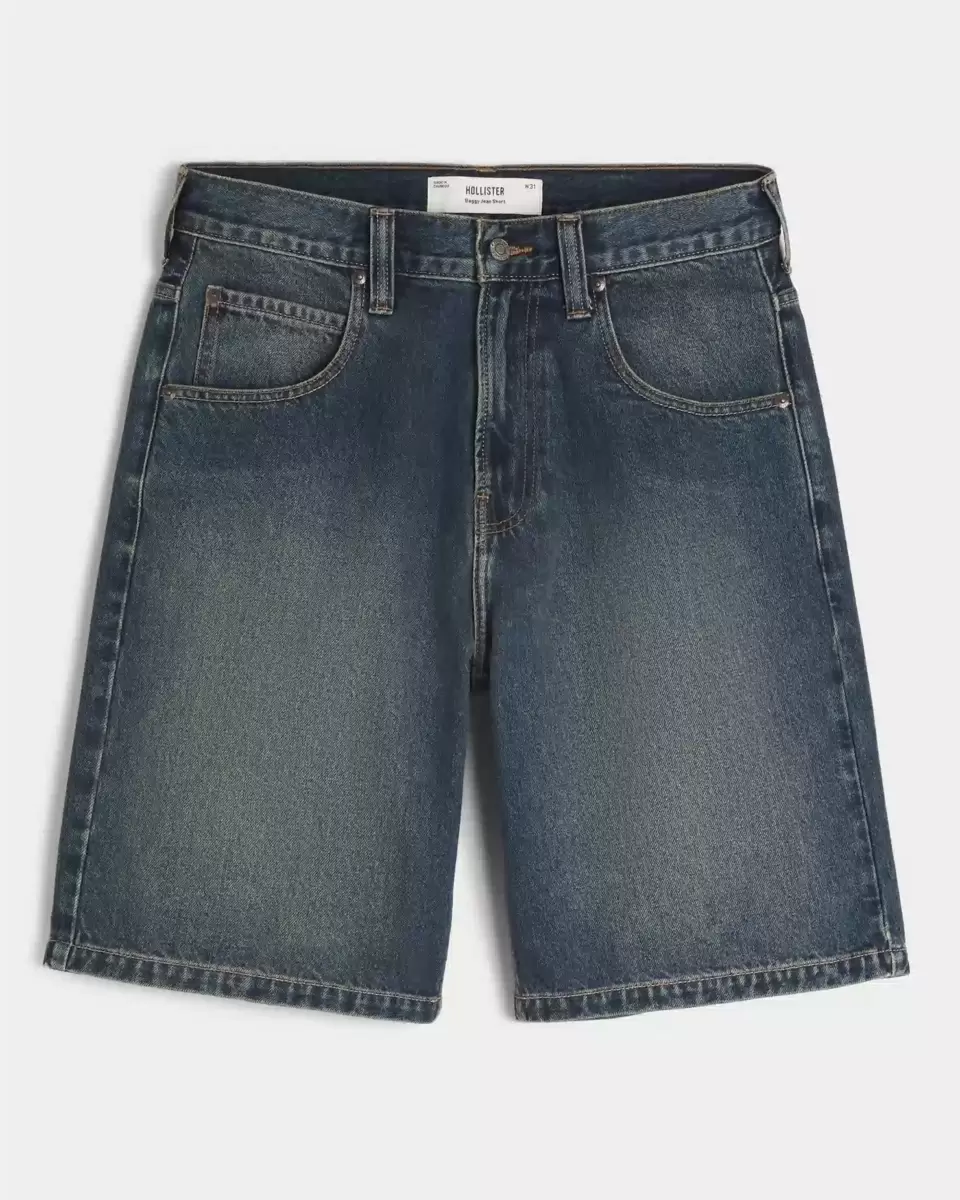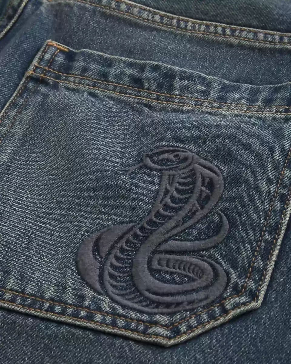 Comfortable denim shorts designed with a baggy leg, featuring an embroidered snake graphic at the back pocket. Fading. Imported.