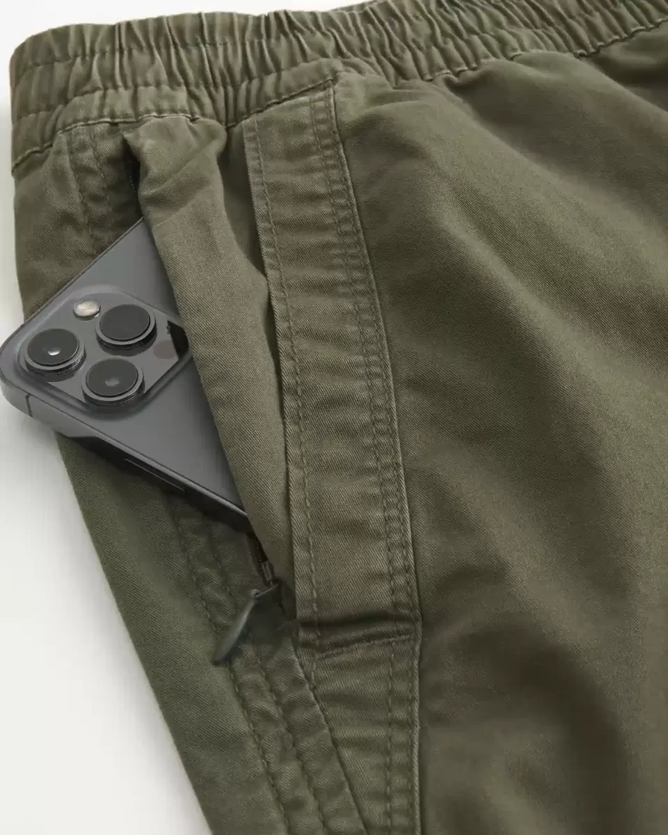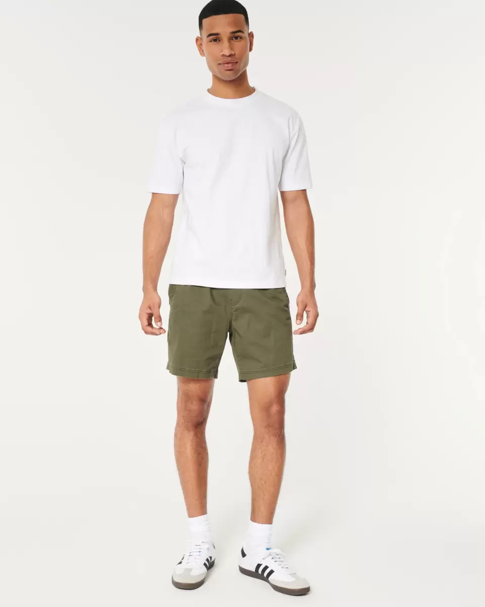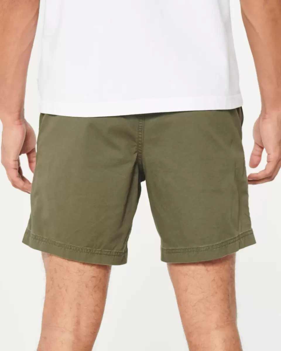 Comfortable pull-on shorts made with Hollister Epic Flex twill, featuring front pockets and a soft drawstring waist. Hidden phone pocket. Hits above the knee. 7″ inseam.