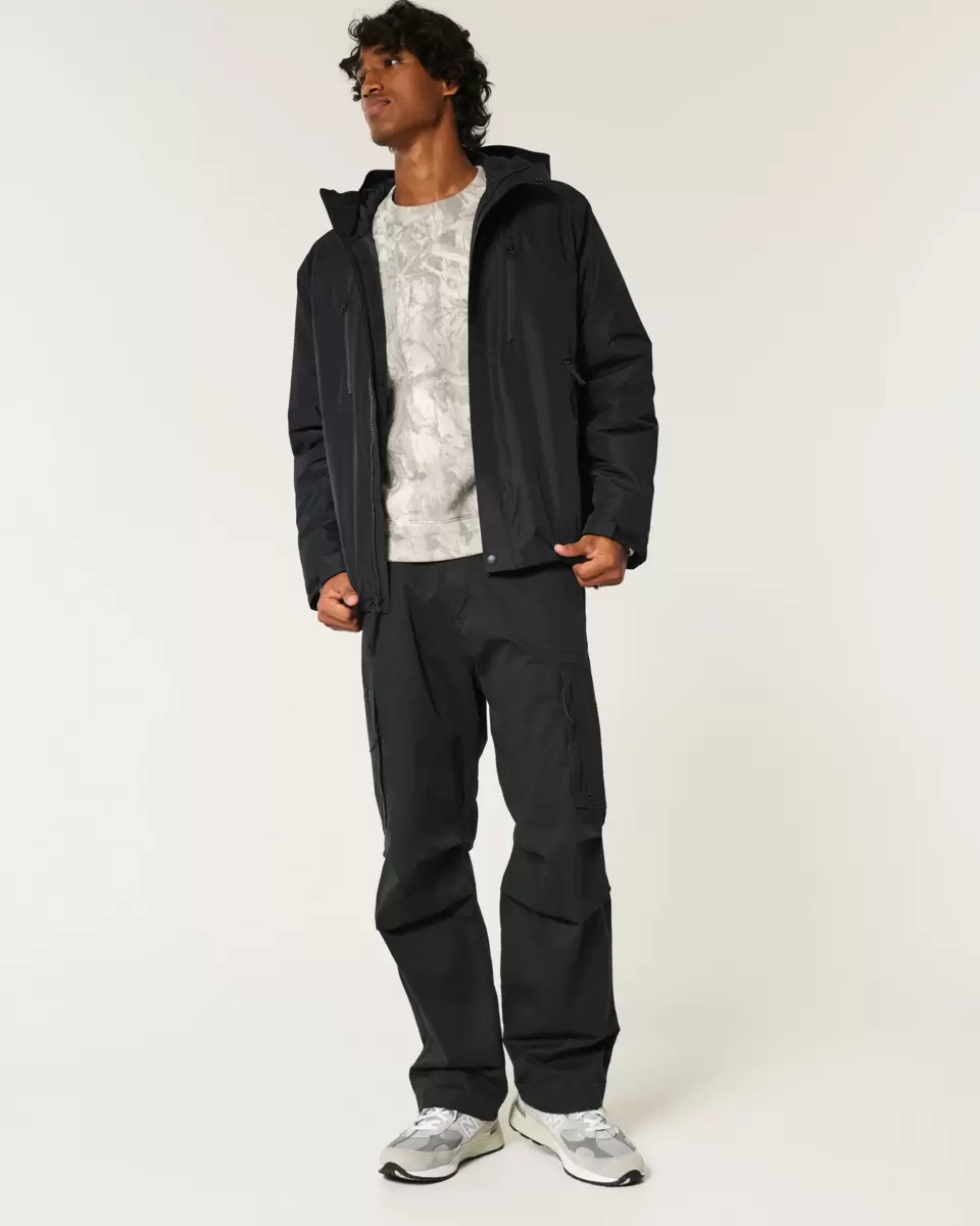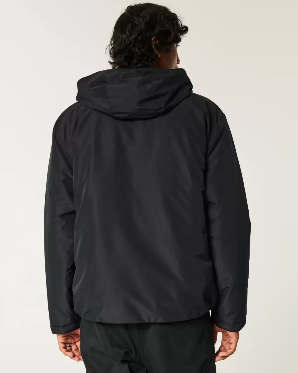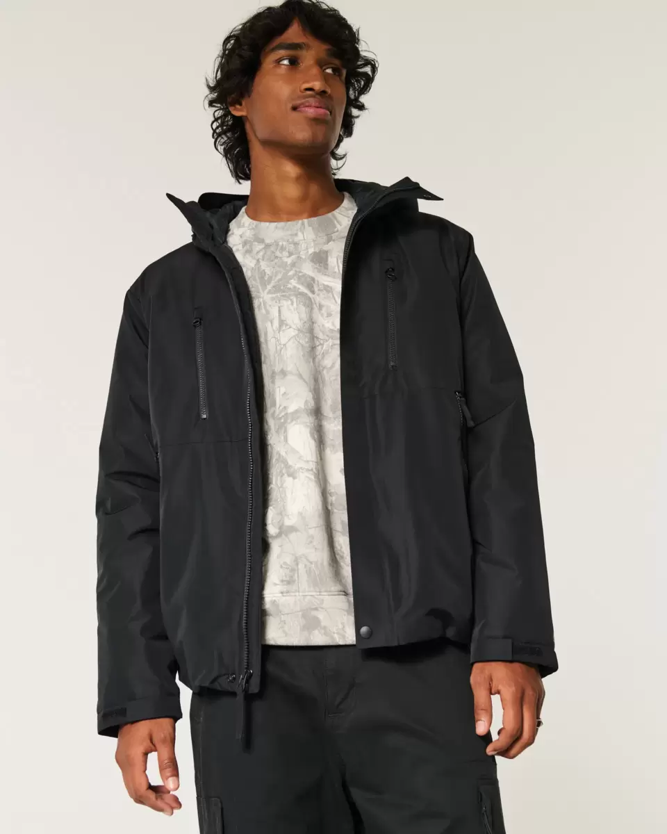 An insulated shell jacket with a hood, chest zipper pockets and front zipper pockets. Adjustable velcro cuffs, full zip-up closure with snaps. Imported.