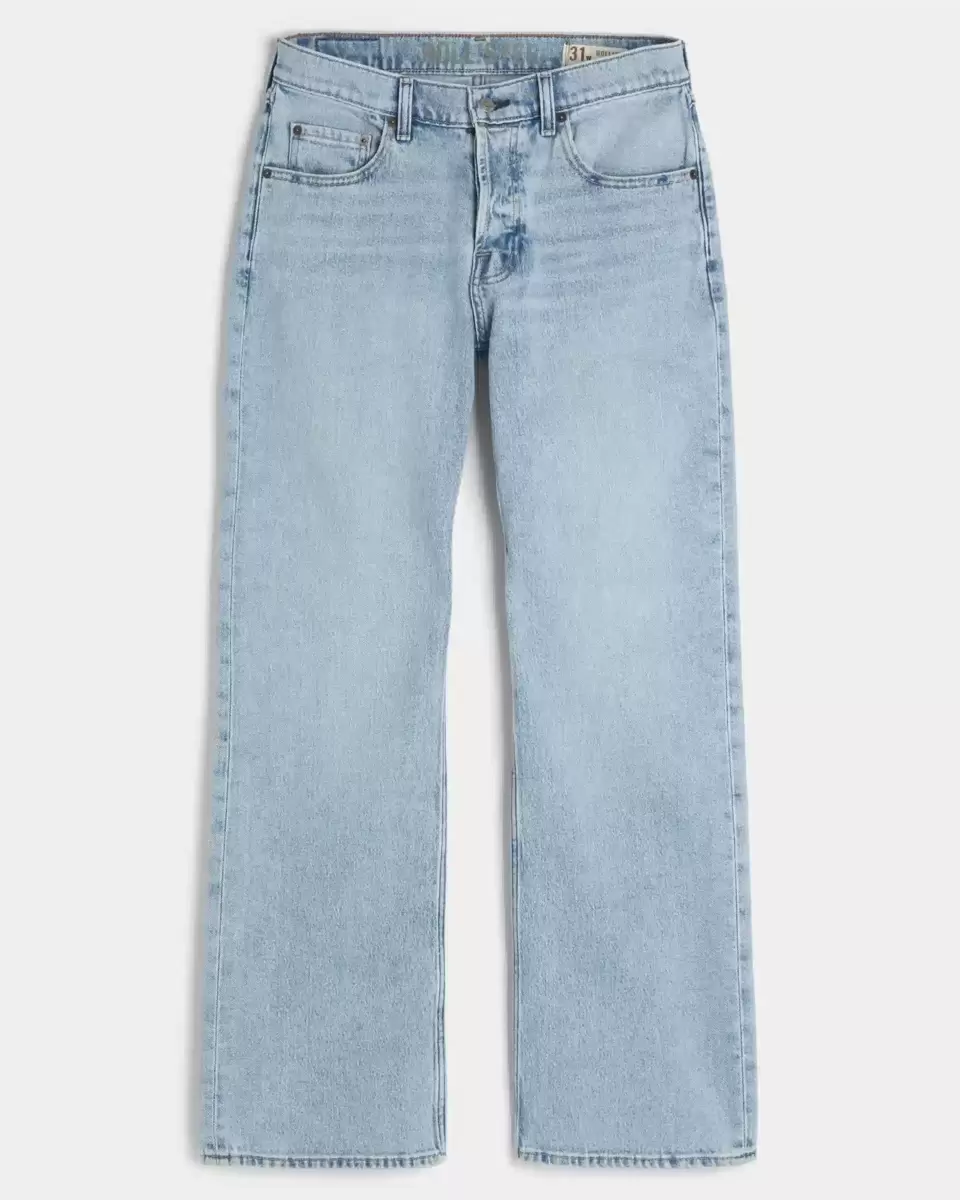 Comfortable denim jeans designed with a relaxed leg and boot opening. Fading and whiskering. Button fly. Trend drop. Imported.