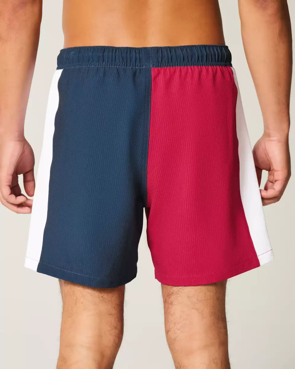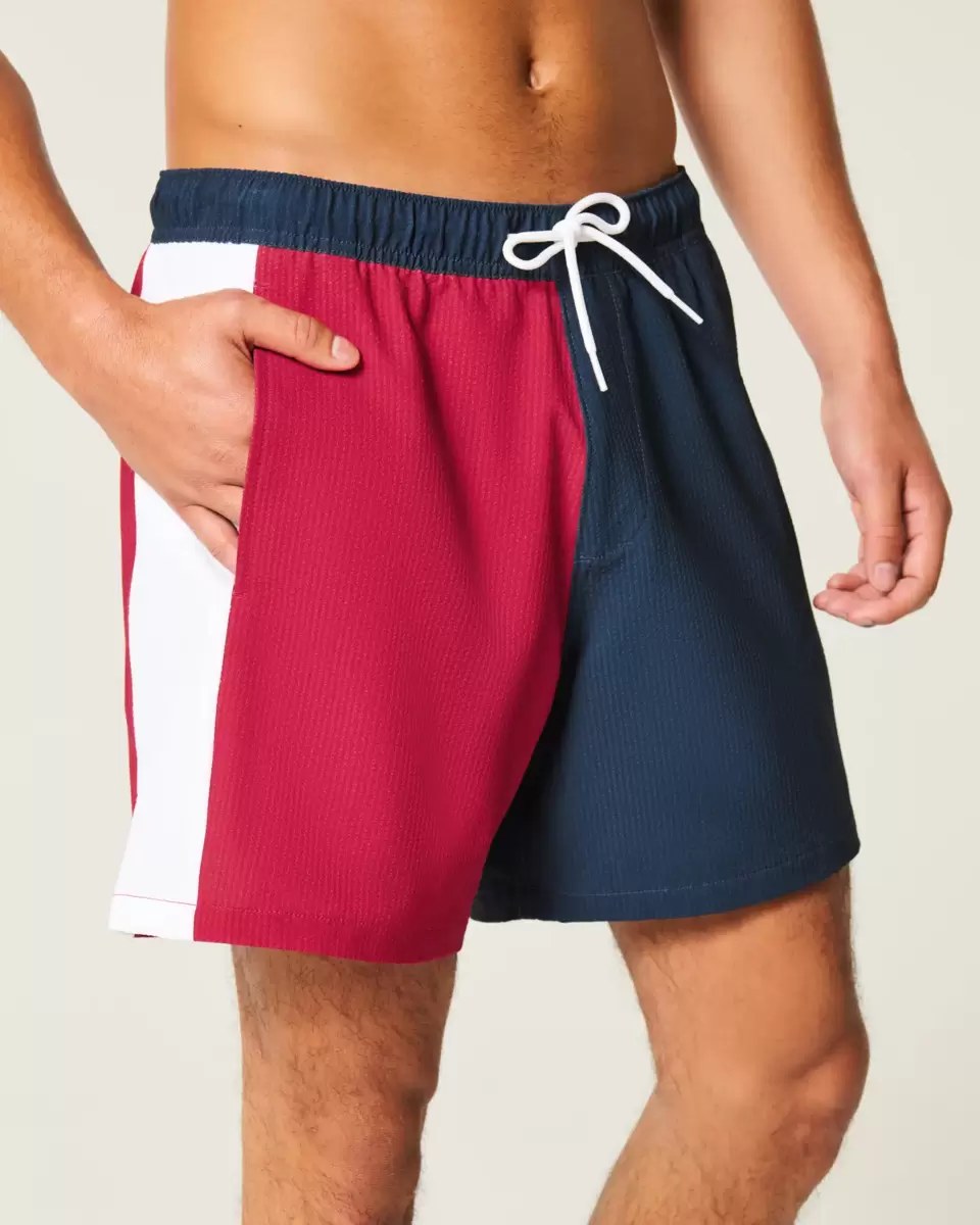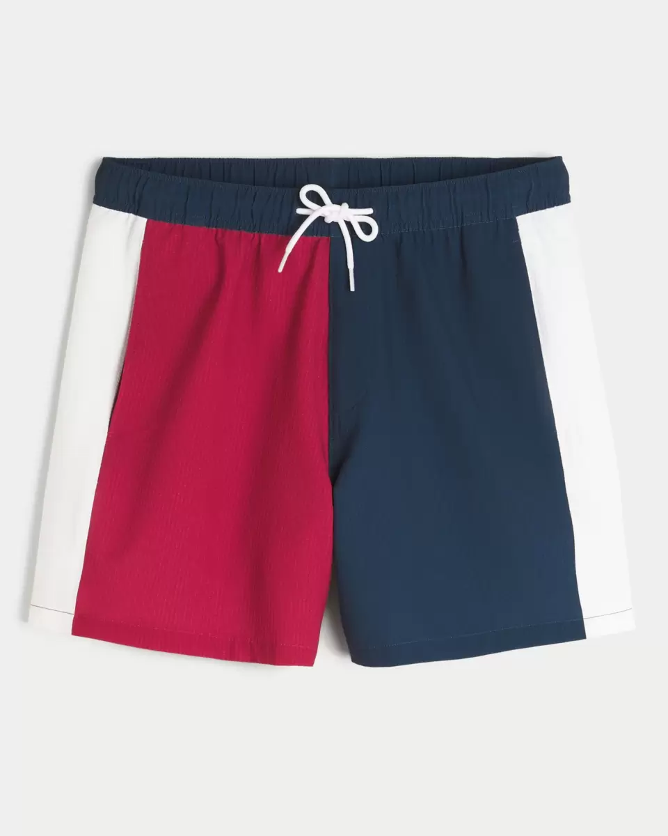 Shorter-length swim trunks that hit mid-thigh. Featuring comfortable 4-way stretch seersucker swim fabric and a 6″ inseam. Front pockets, mesh lining. Imported.