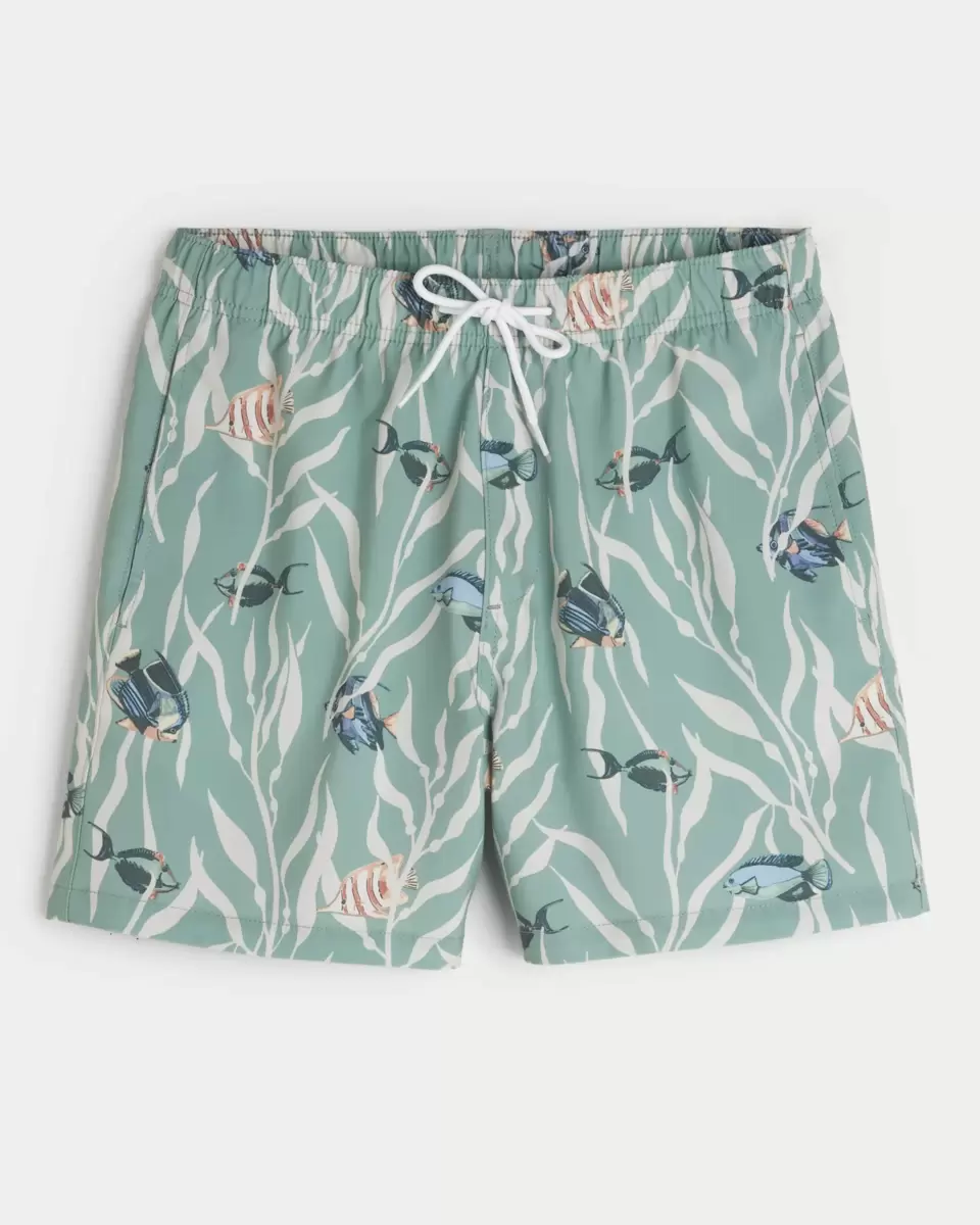 Shorter-length swim trunks that hit mid-thigh. Featuring comfortable 4-way stretch swim fabric and a 6″ inseam. Pockets. Imported.