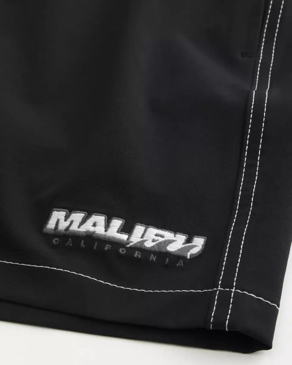 Shorter-length swim trunks that hit mid-thigh. Featuring comfortable 4-way stretch swim fabric and a 6″ inseam. Pockets, contrast stitching, embroidered Malibu California deta