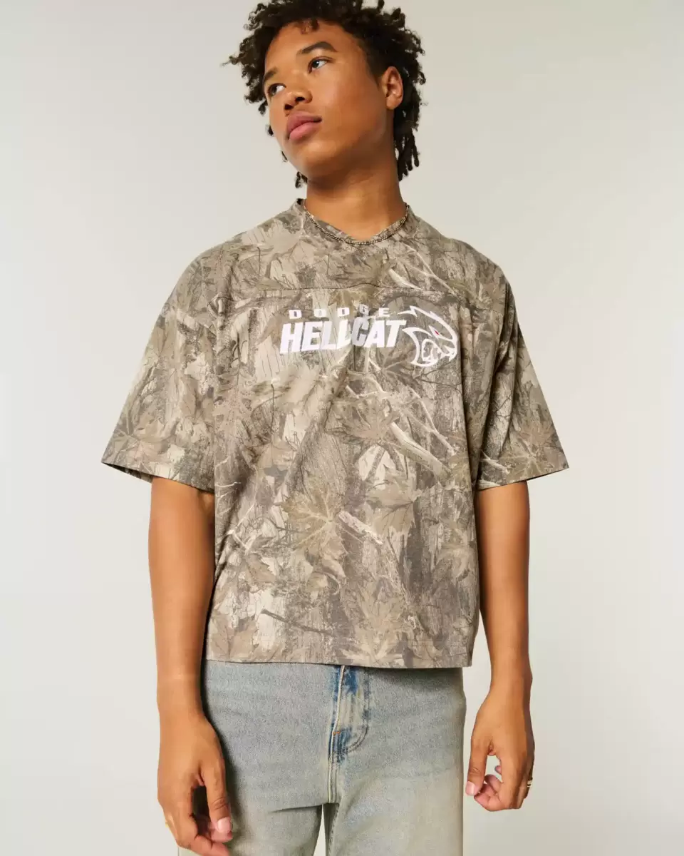A super soft football tee in heavyweight cotton, featuring official licensed Dodge Hellcat graphic embroidery and an all-over camo pattern. V-neckline, short sleeves. Baggy Crop Fi