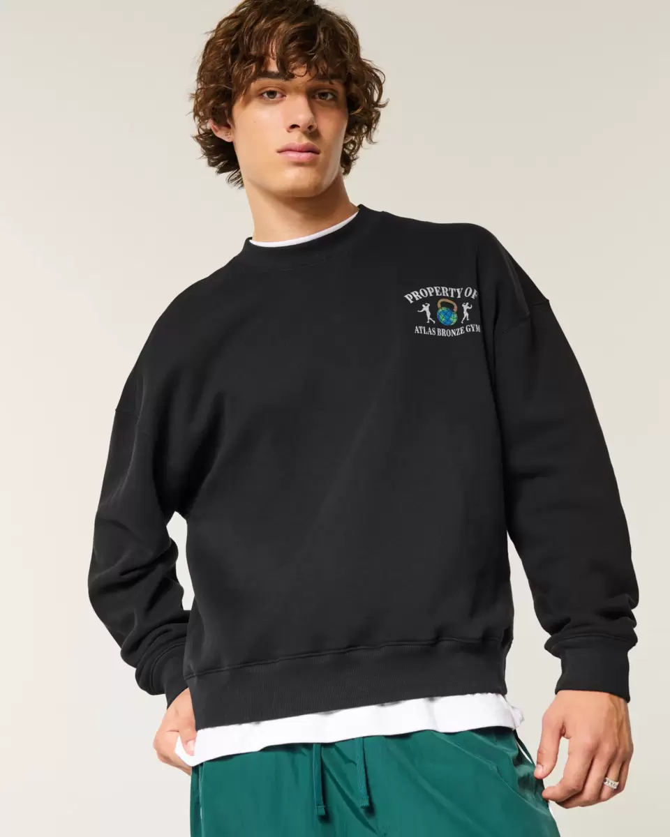 A super soft fleece sweatshirt featuring Atlas Bronze Gym print graphics at the left chest and back. Crew neckline, long sleeves. Boxy Fit. Imported.