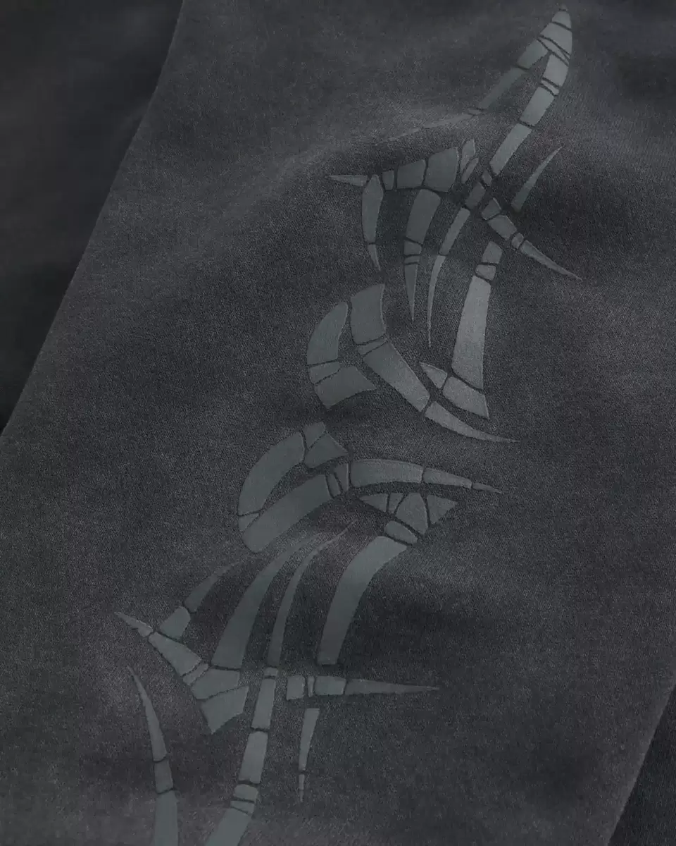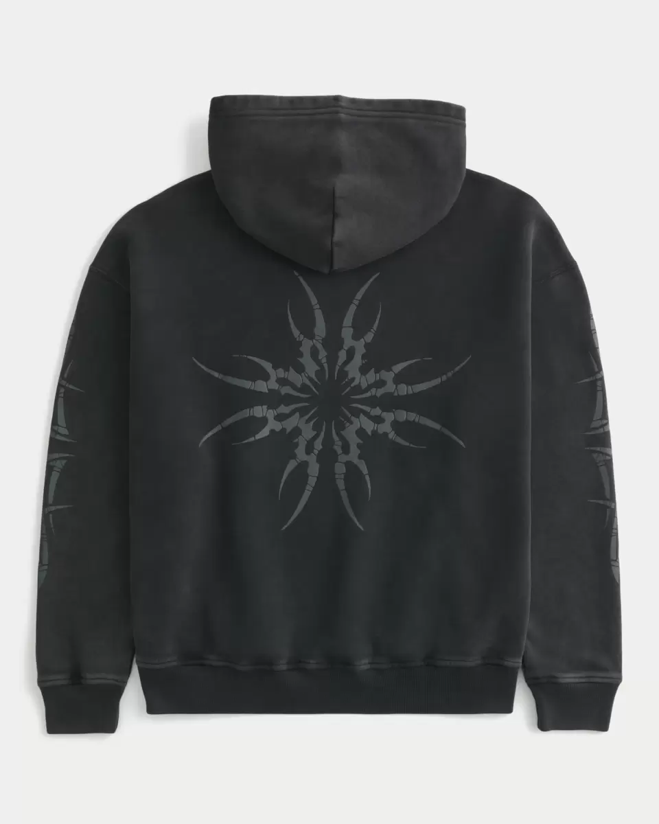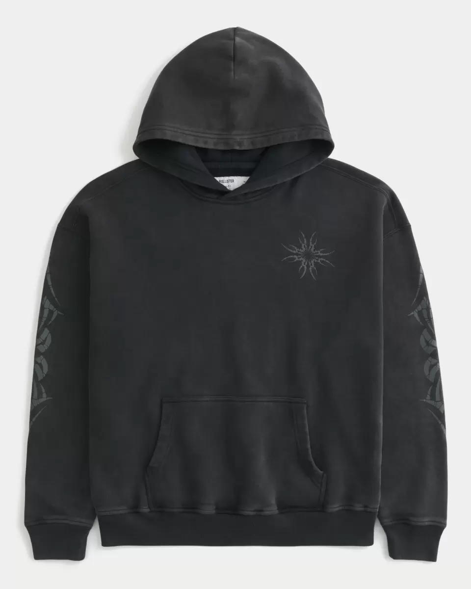 A super soft fleece hoodie featuring print graphics at the left chest, sleeves and back. Front pouch pocket, long sleeves, hood. Boxy Fit. Imported.