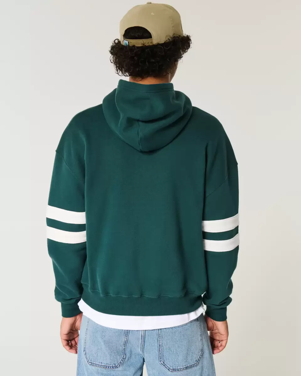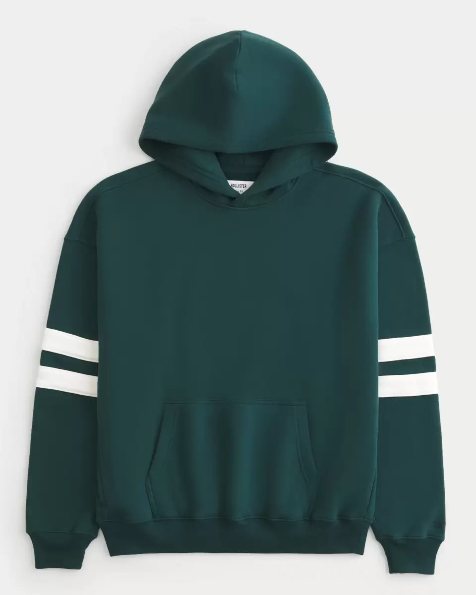 This super soft fleece hoodie has long sleeves and a front pouch pocket. Long sleeves with stripes, hood. Boxy Fit. Imported.