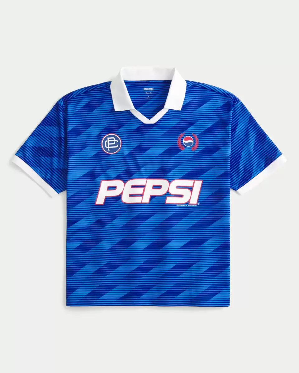 A classic soccer jersey in soft, sporty fabric, featuring official licensed Pepsi graphics. Number graphic at back, short sleeves, collar. Boxy Fit. Imported.