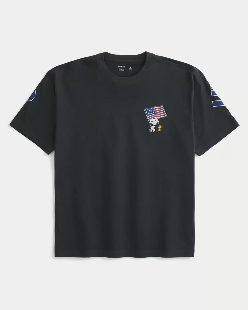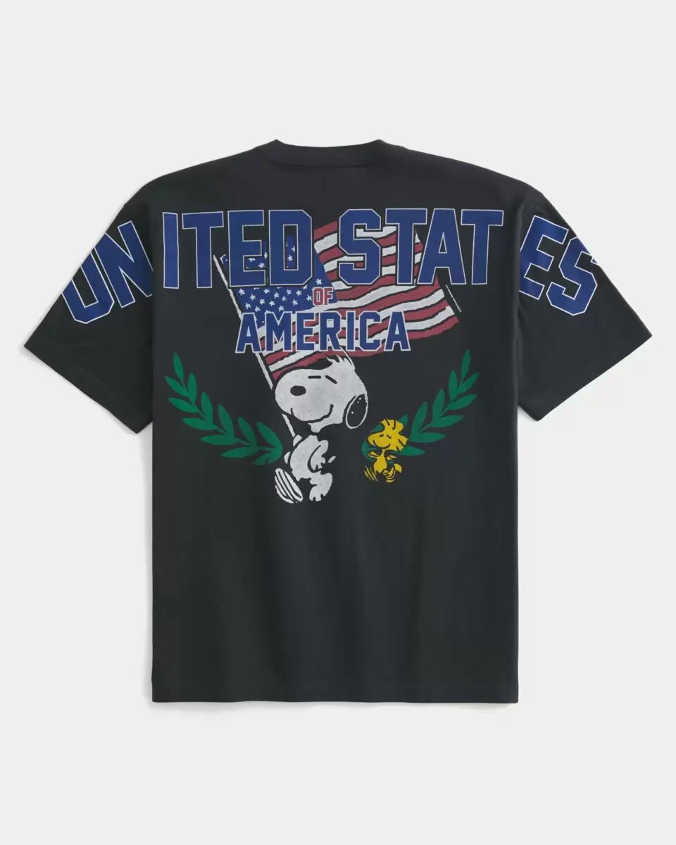 This super soft 100% cotton tee features official Peanuts-licensed Snoopy and Woodstock United States print graphics at the left chest and back. Crew neckline, short sleeves. Boxy Fit. Imported.