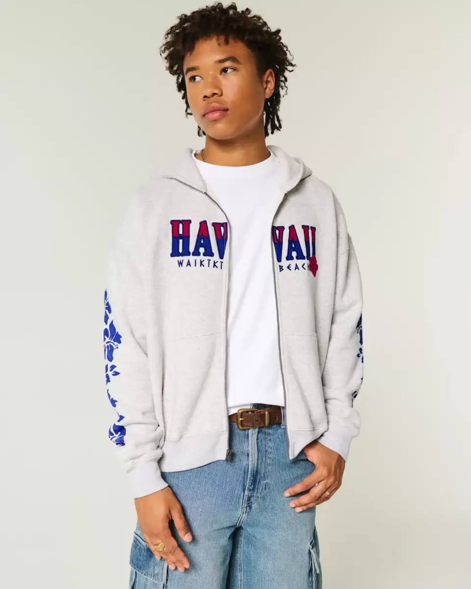 Super soft and comfortable, this fleece sweatshirt features Waikiki Beach Hawaii graphic embroidery at the chest and floral print graphics at the sleeves. Full zip-up closure, front pockets. Boxy Fit. Imported.