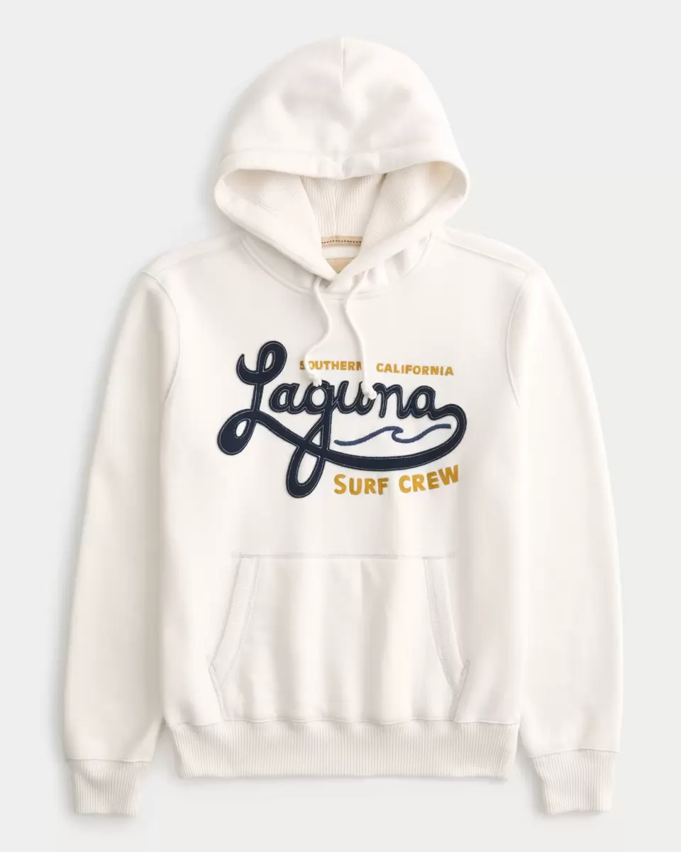 A classic fleece hoodie with super soft waffle lining, featuring Laguna Surf Crew graphic applique and embroidery. Drawstring hood, front pouch pocket, long sleeves. Trend drop. Imported.