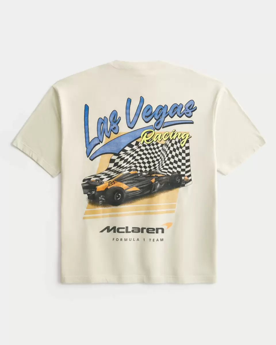 A super soft 100% cotton tee featuring official licensed McLaren Formula 1 Team print graphics at the left chest and Las Vegas graphics at the back. Crew neckline, short sleeves. Boxy Fit. Imported.