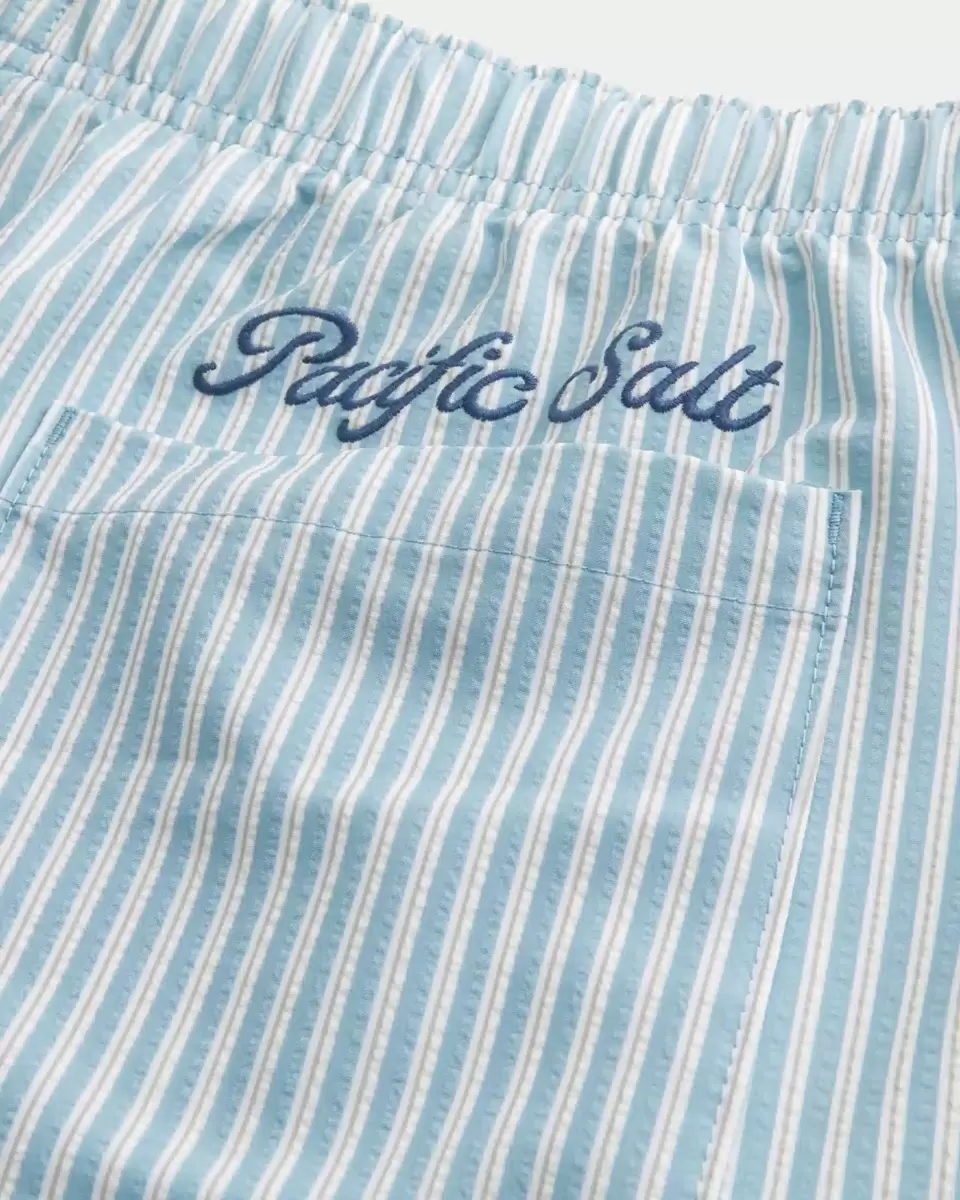 Shorter-length swim trunks that hit mid-thigh. Featuring comfortable 4-way stretch seersucker swim fabric and a 5.5″ inseam. Front pockets, mesh lining. Imported.