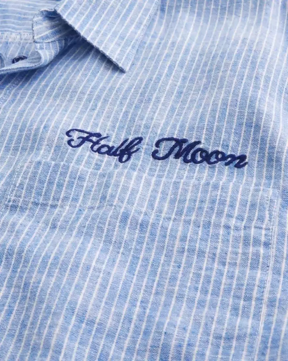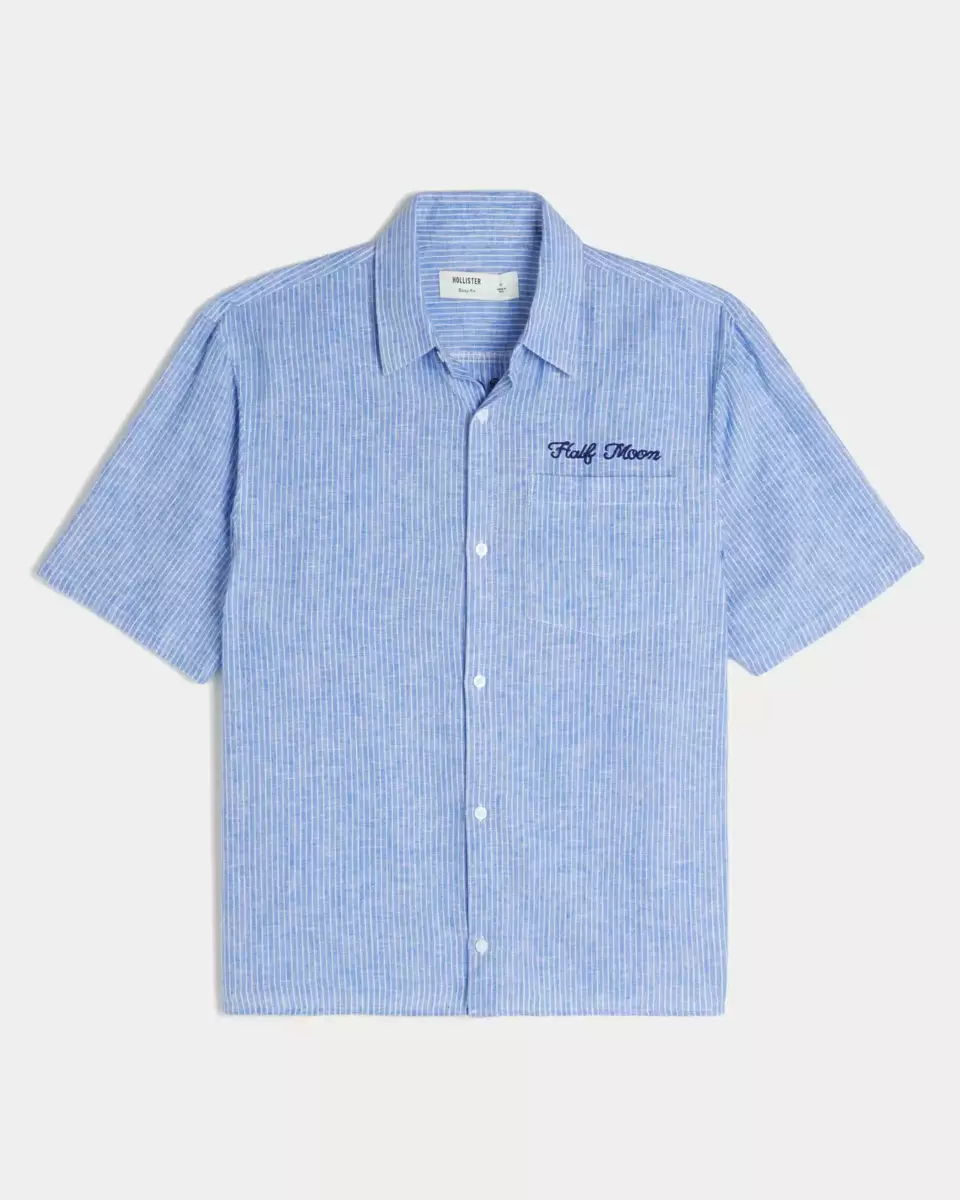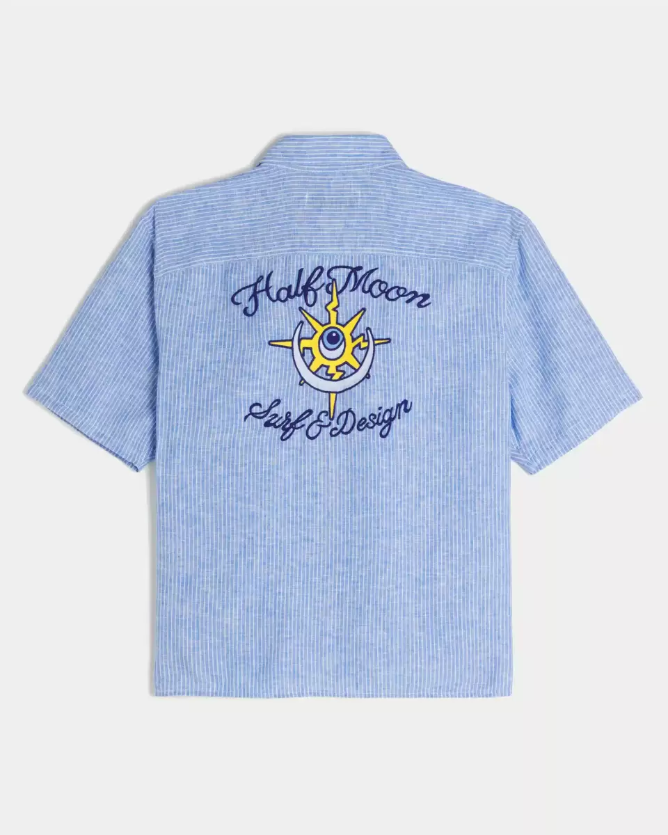 This classic shirt is made with a soft linen blend and features Half Moon graphic embroidery above the left chest pocket and at the back. Camp collar, short sleeves, full button closure. Boxy Fit. Imported.