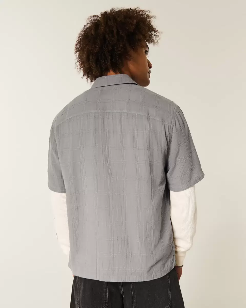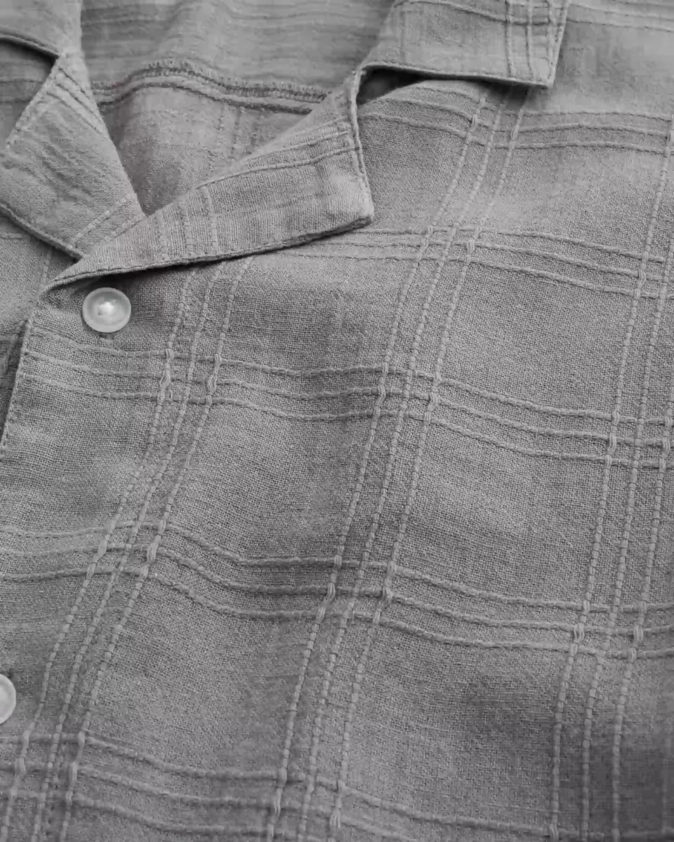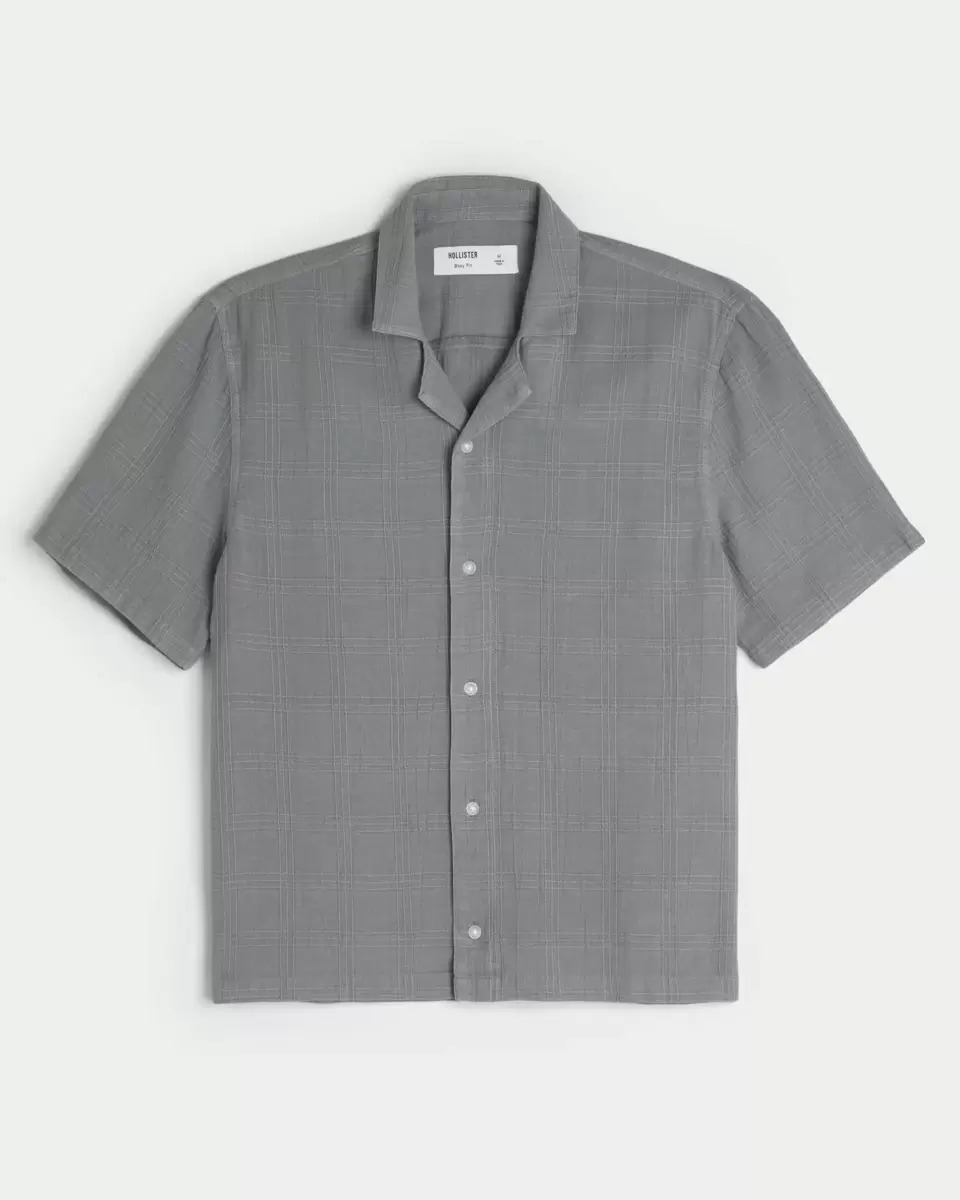 This classic short-sleeve shirt is made with a soft linen blend and features a textured pattern. Camp collar, full button closure. Boxy Fit. Imported.