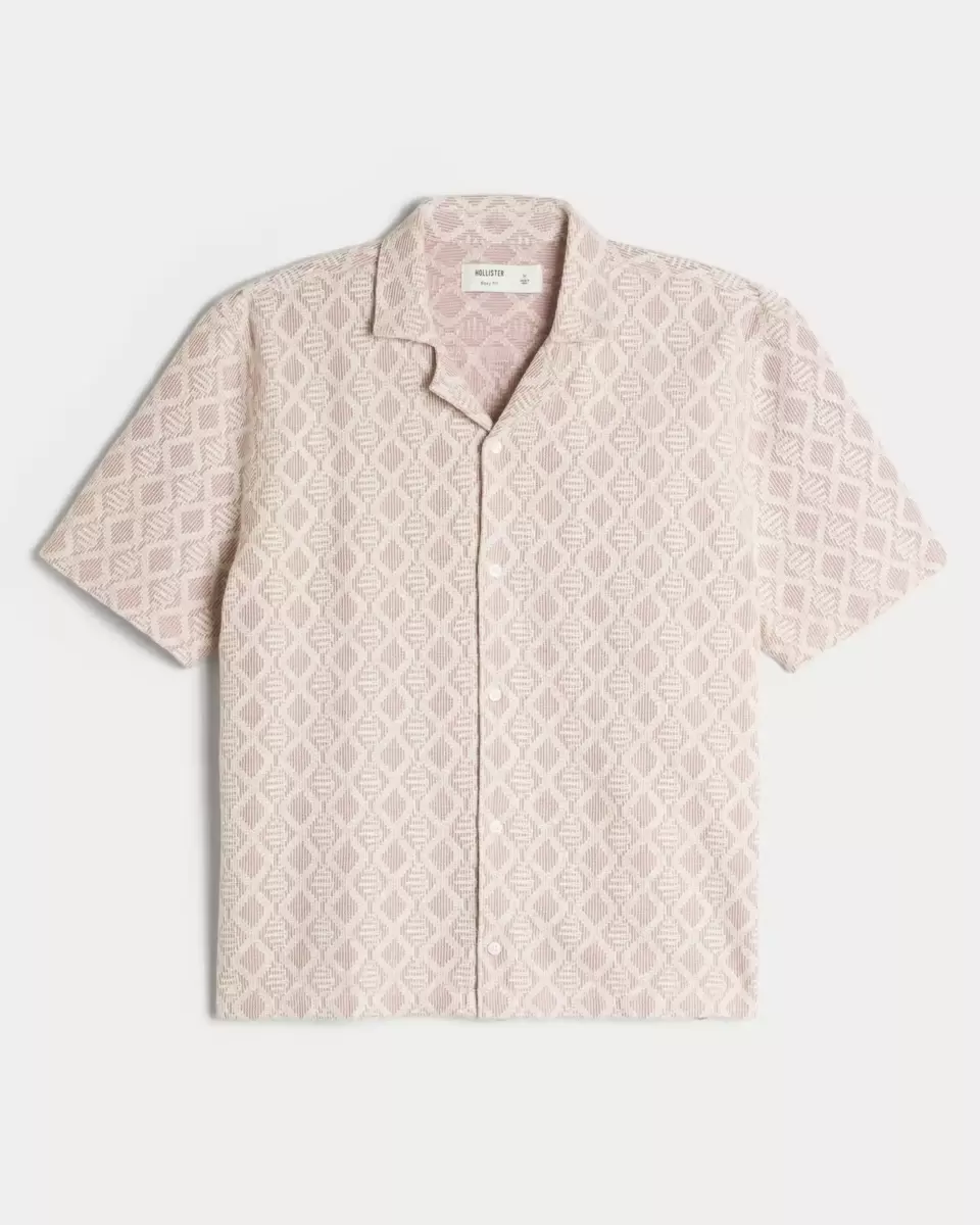 Made with soft crochet-style fabric, this classic button-through shirt features an all-over diamond pattern and short sleeves. Button closure, collar. Boxy Fit. Imported.