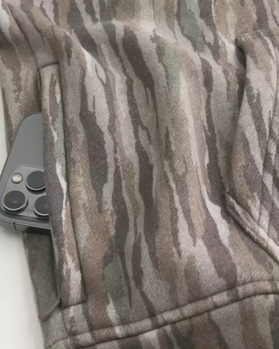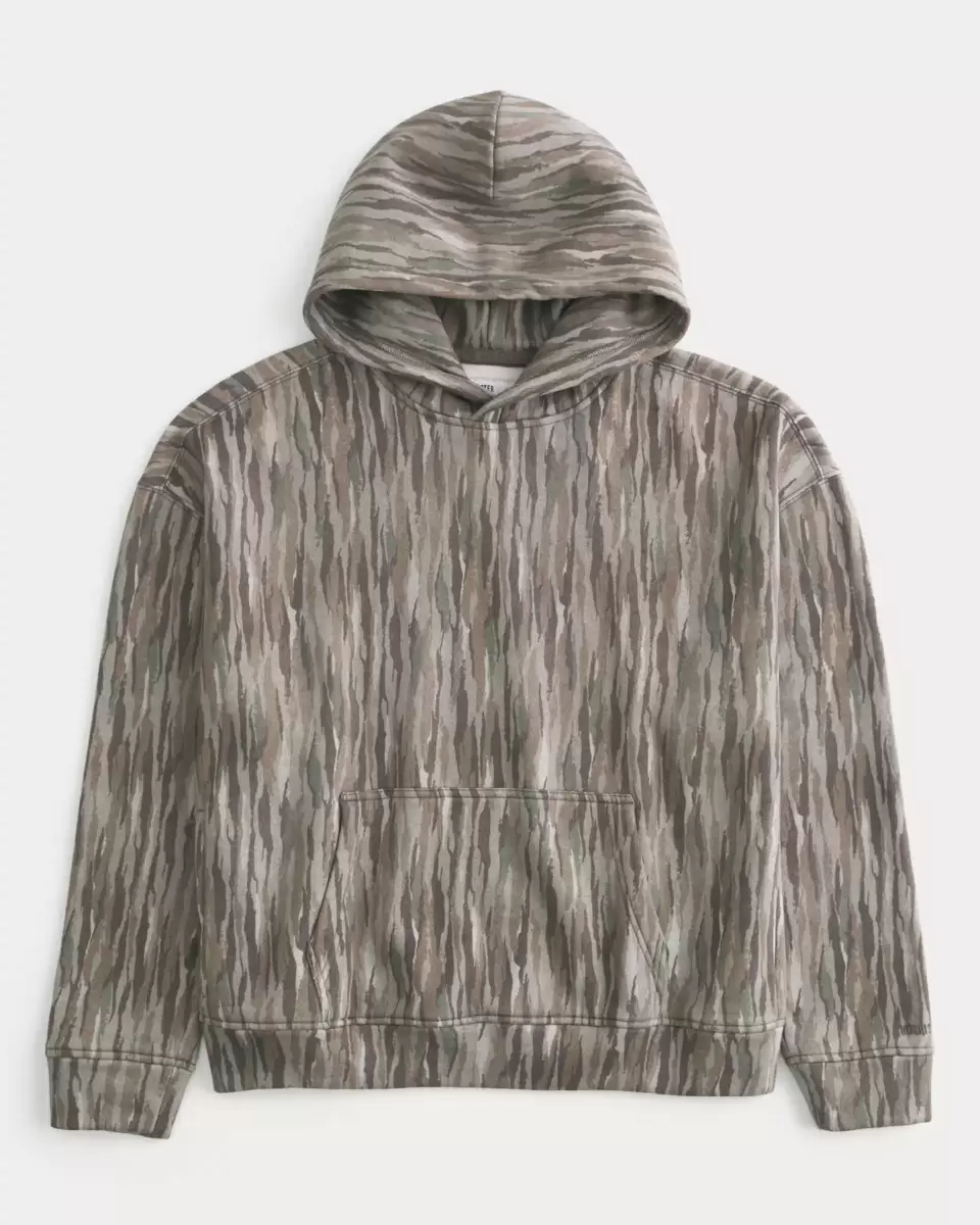 This super soft, ultra-comfortable fleece hoodie features an all-over camo pattern. Hood, front pouch pocket, long sleeves. Boxy Fit. Imported.