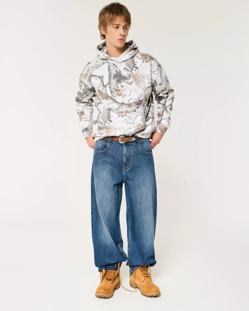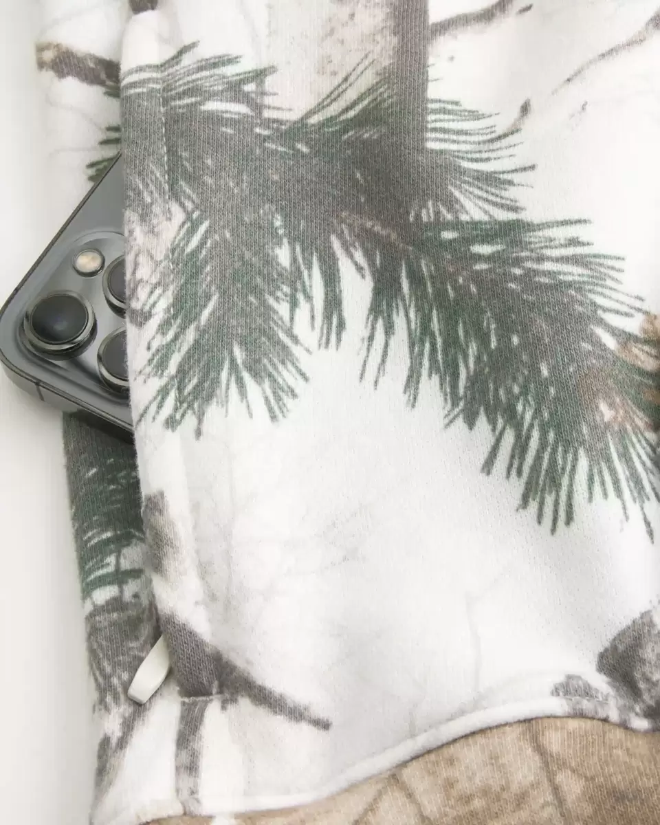 A super soft fleece hoodie featuring an all-over camo pattern. Hood, front pouch pocket, long sleeves. Boxy Fit. Imported.