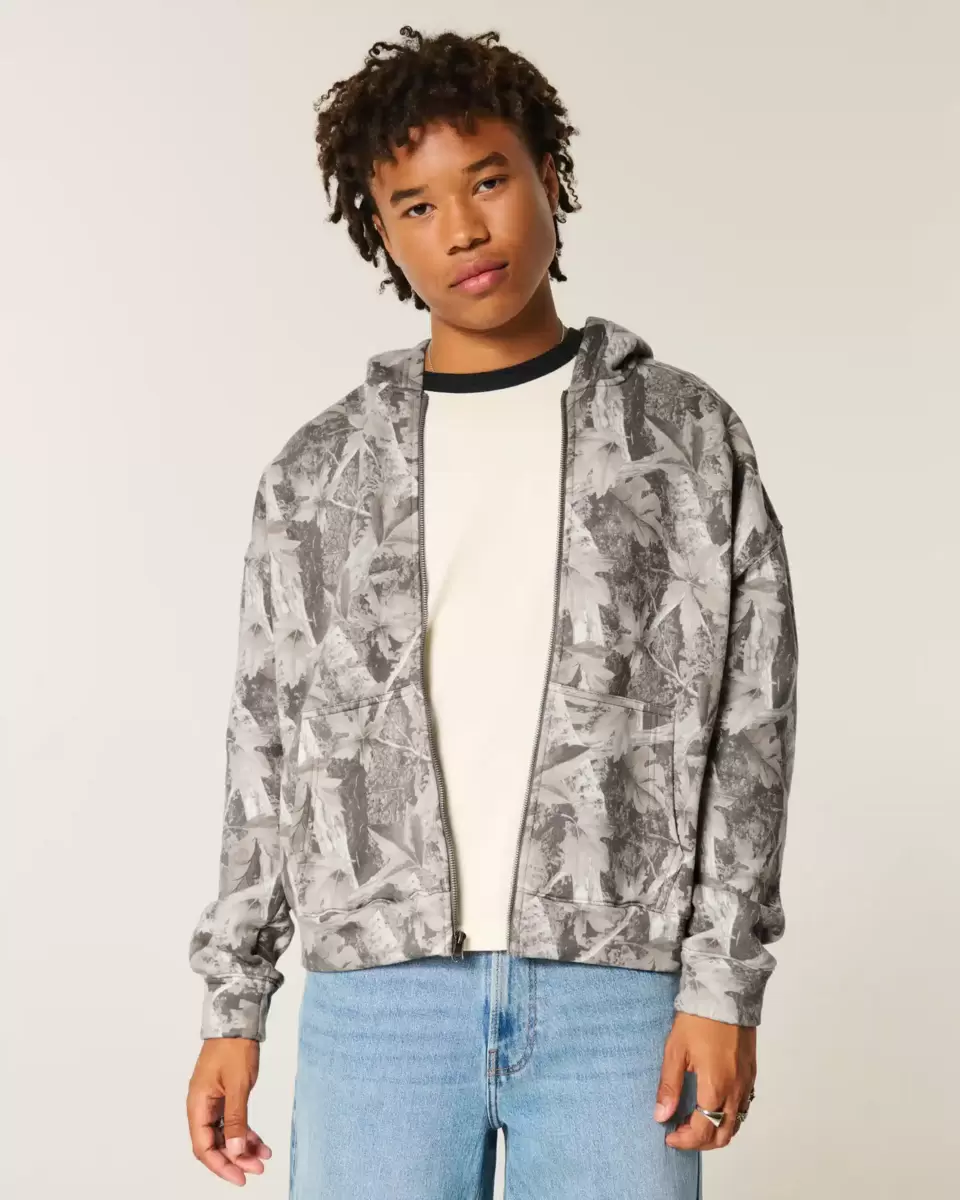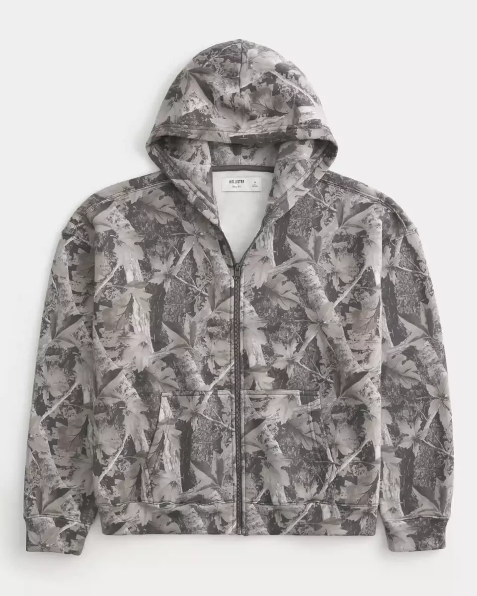 This super soft fleece hoodie features an all-over camo pattern and full zip-up closure. Long sleeves, hood, front pockets. Boxy Fit. Imported.
