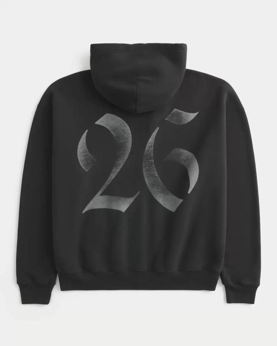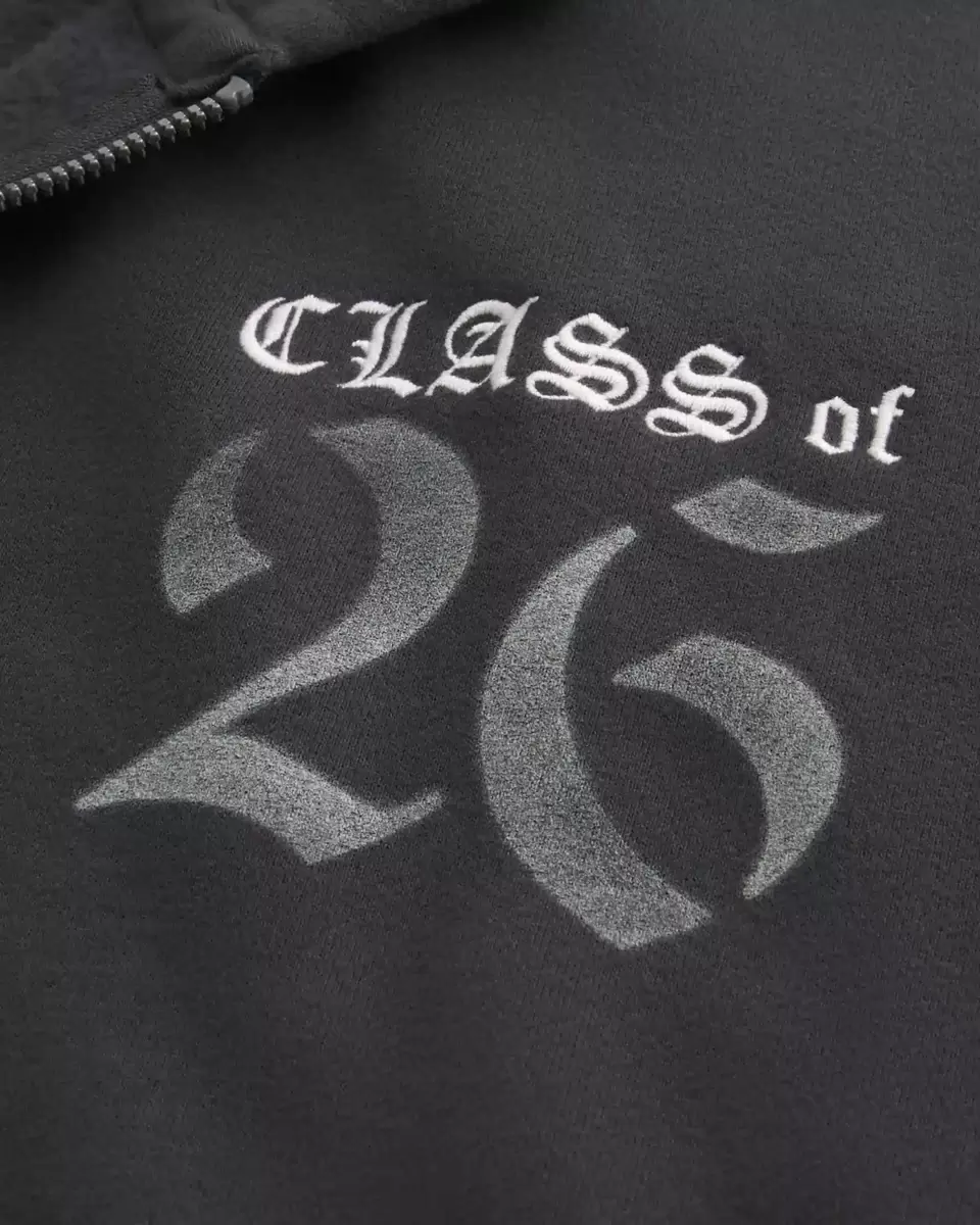 A super soft fleece hoodie featuring Class of 26 print graphics at the left chest and a bold 26 print graphic at the back. Full zip-up closure, front pockets, long sleeves, hood. Boxy Fit. Imported.