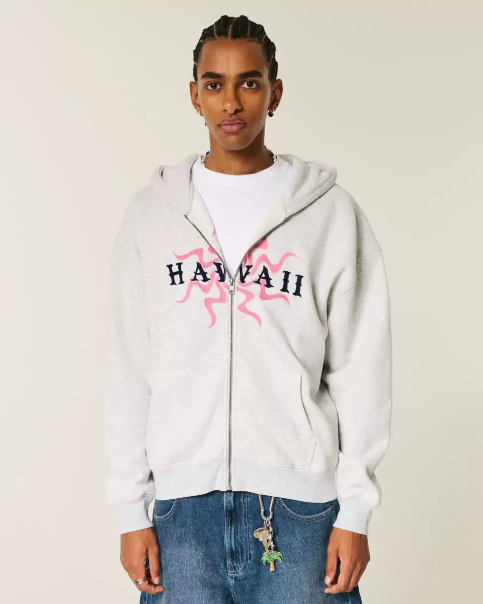 A super soft fleece hoodie featuring Hawaii graphic embroidery. Full zip-up closure, long sleeves, front pockets, hood. Boxy Fit. Imported.