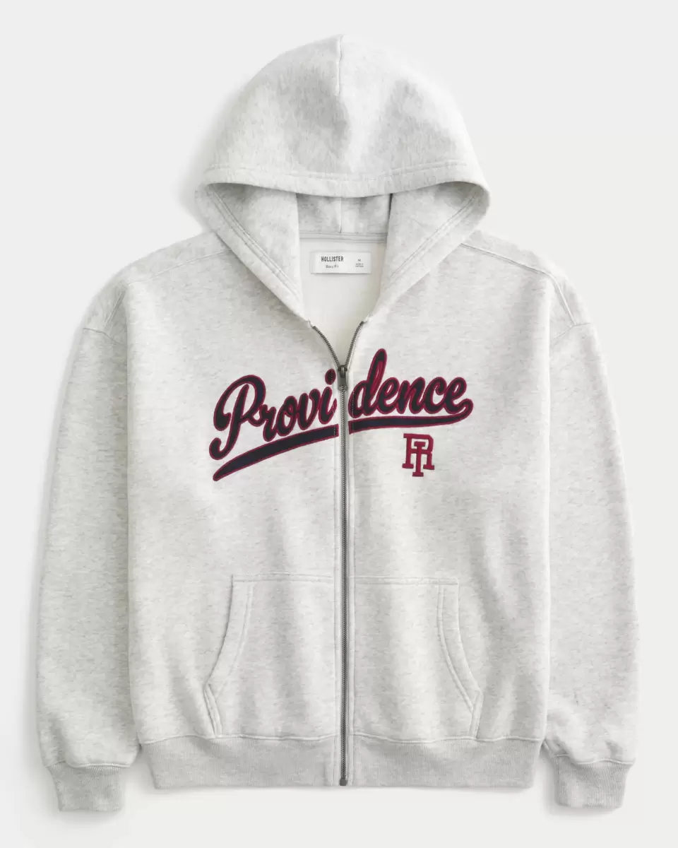 A super soft fleece hoodie featuring Providence Rhode Island graphic applique and embroidery. Full zip-up closure, front pockets, hood, long sleeves. Boxy Fit. Imported.