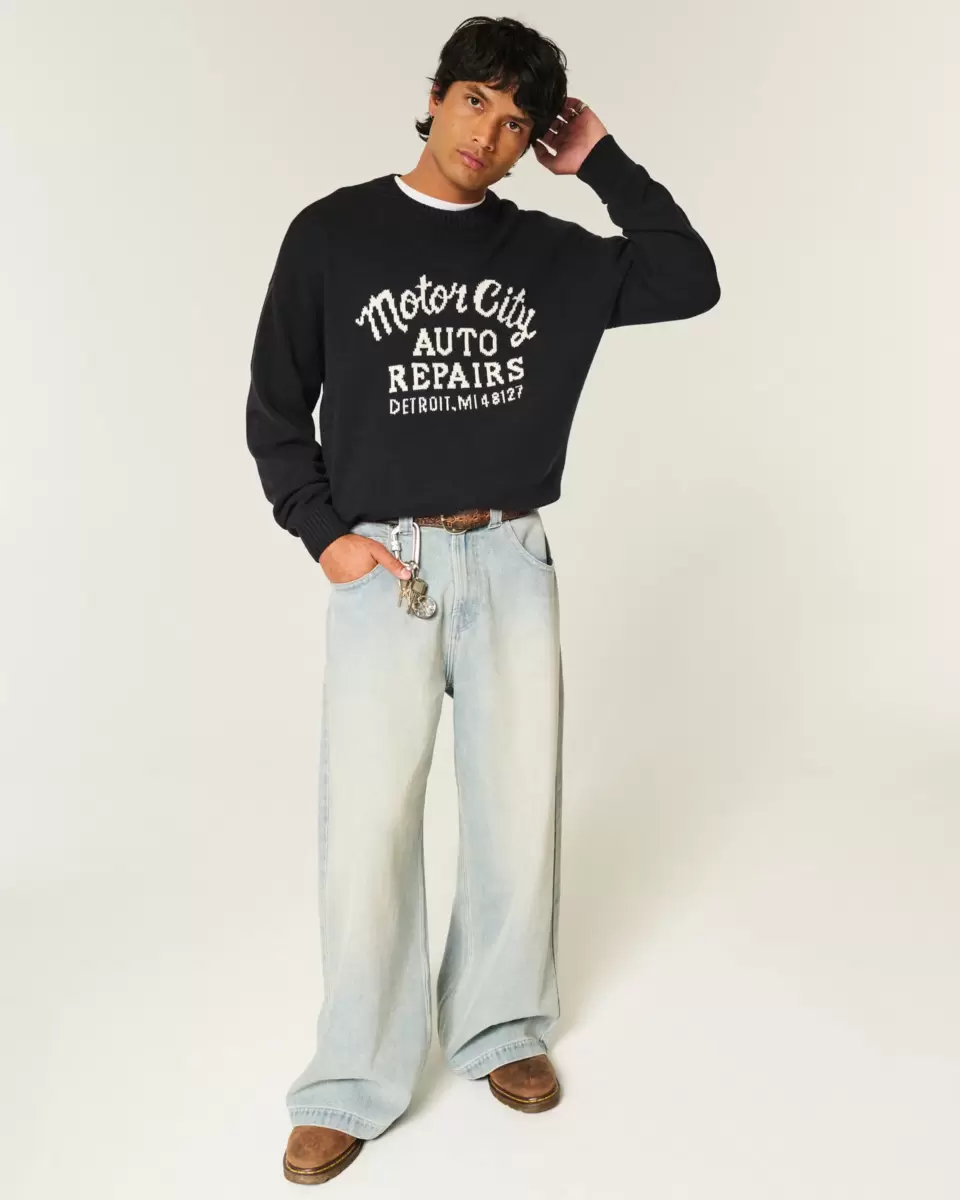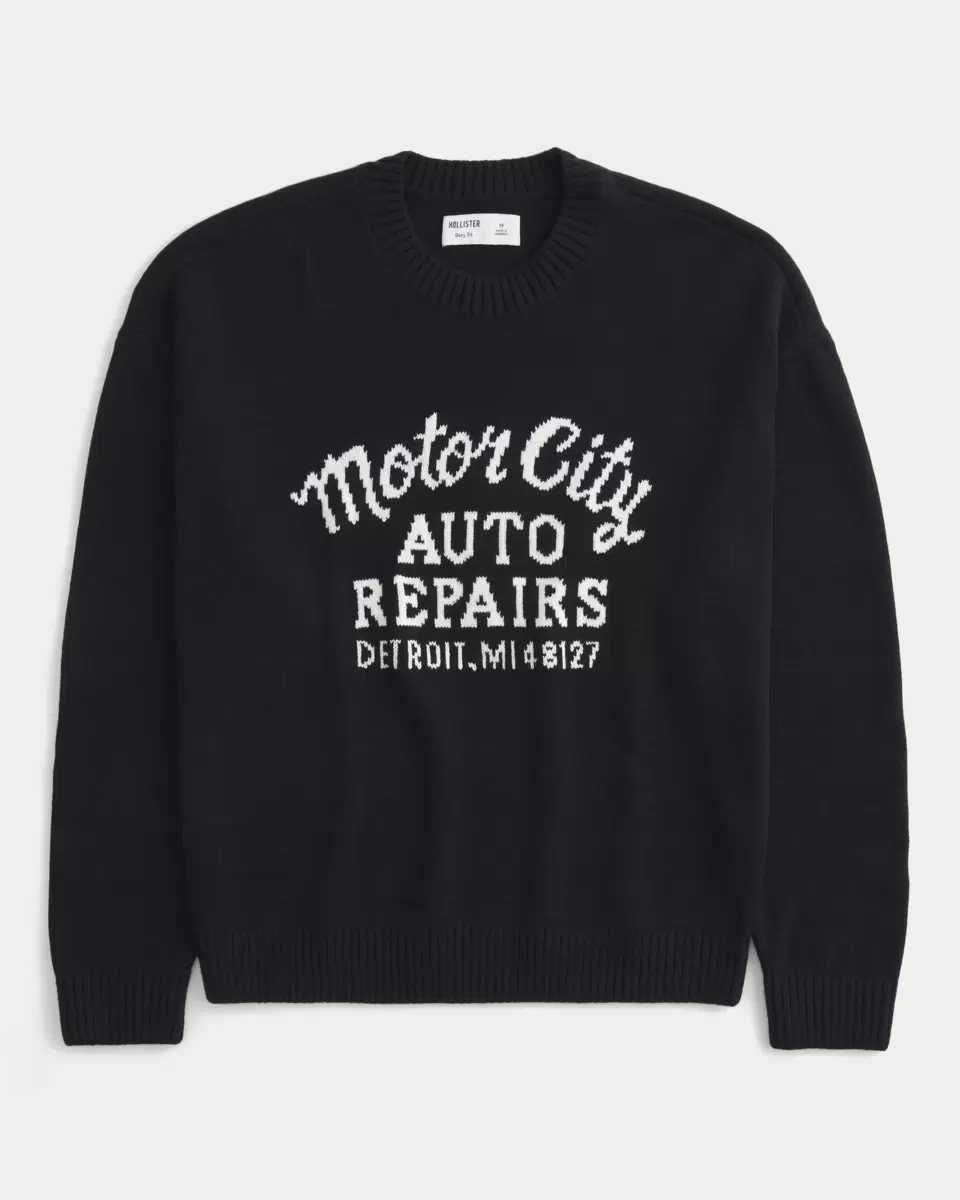 A super soft and comfortable sweater with Motor City Auto Repairs Detroit Michigan intarsia graphics. Crew neckline, long sleeves, ribbed trims. Boxy Fit. Imported.