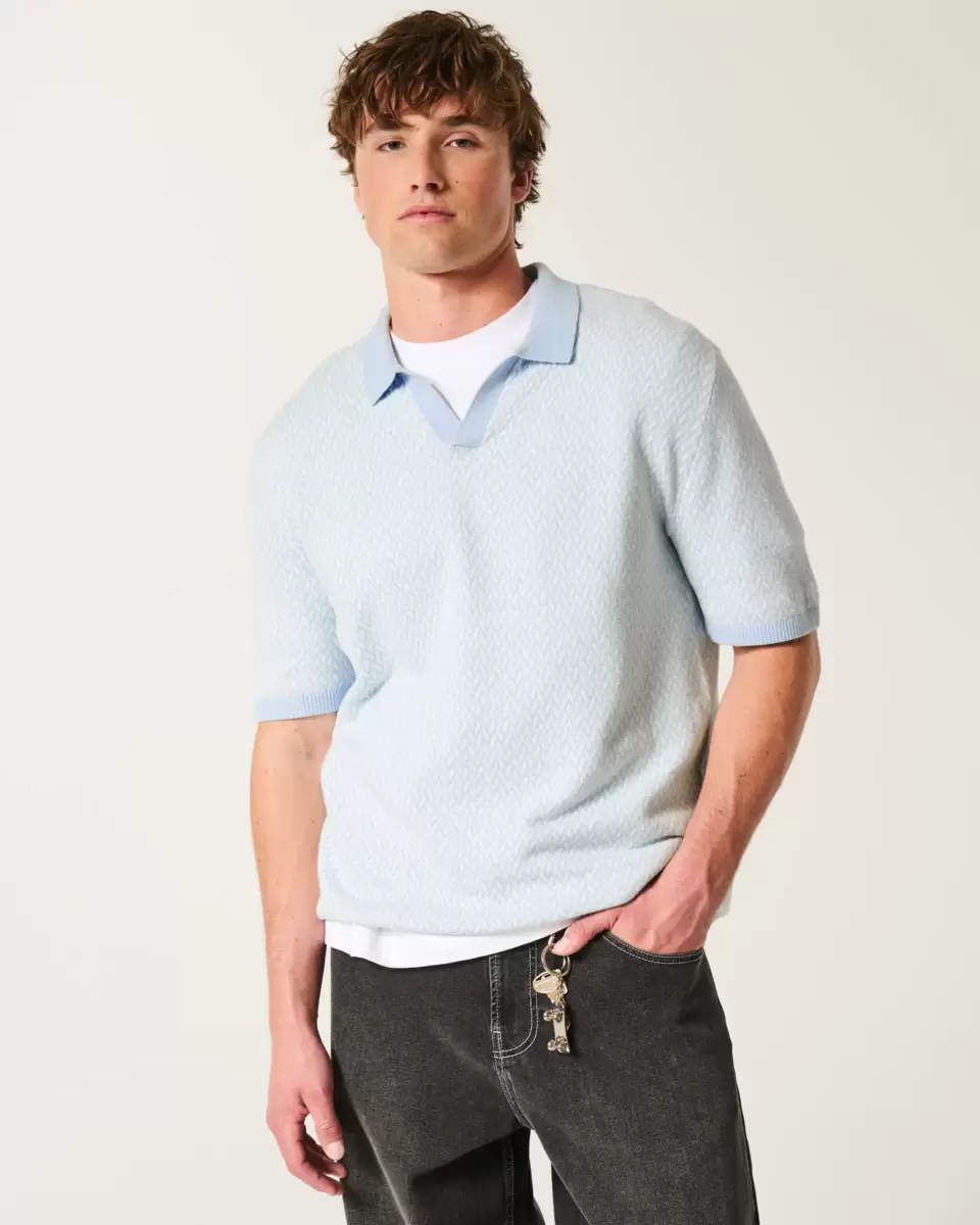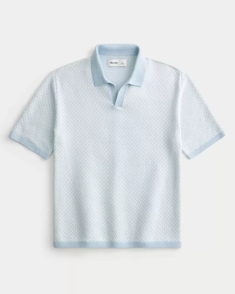 This sweater polo is made with super soft knit material featuring a classic geo pattern. Collar, short sleeves, buttonless placket, ribbed hems. Boxy Fit.