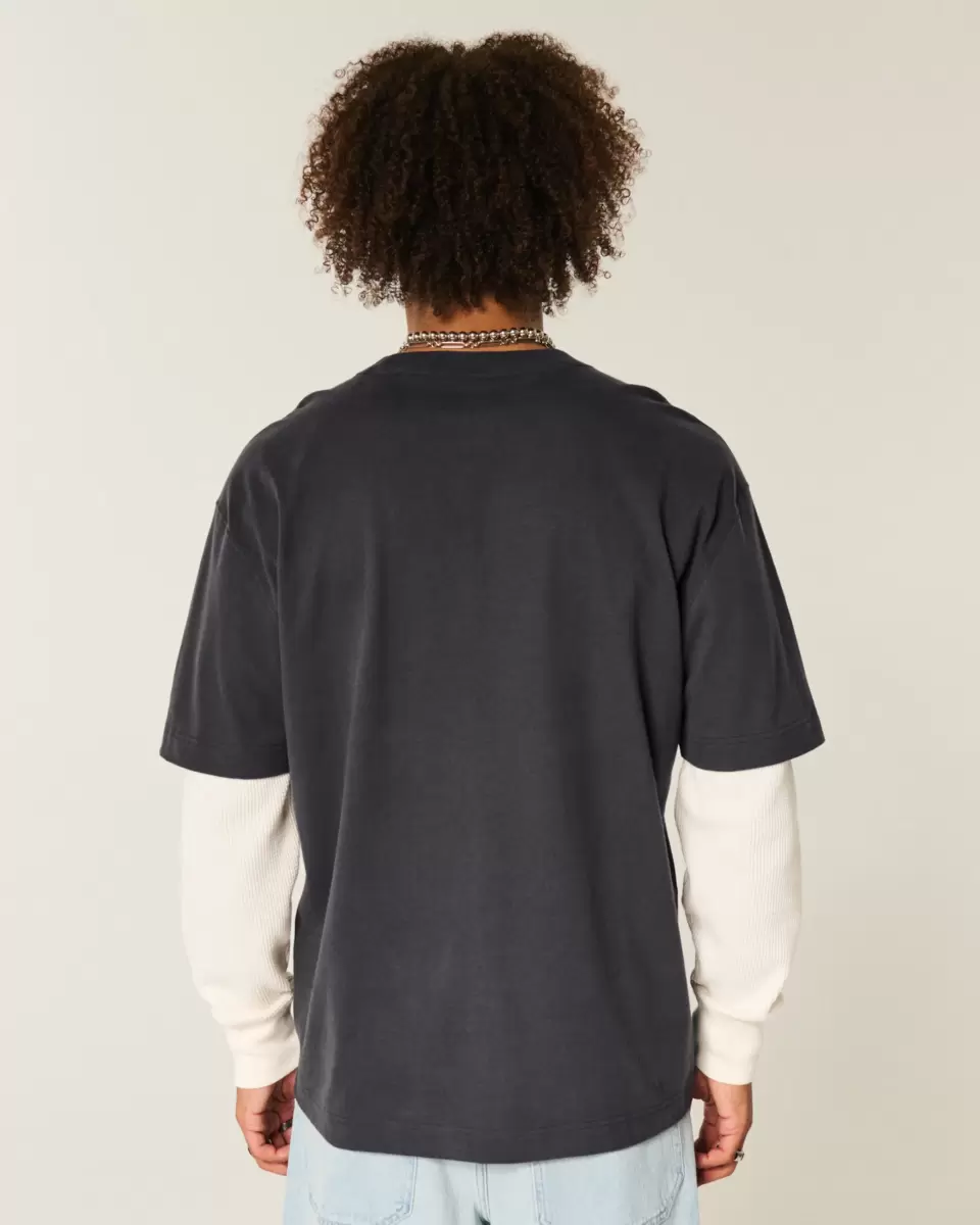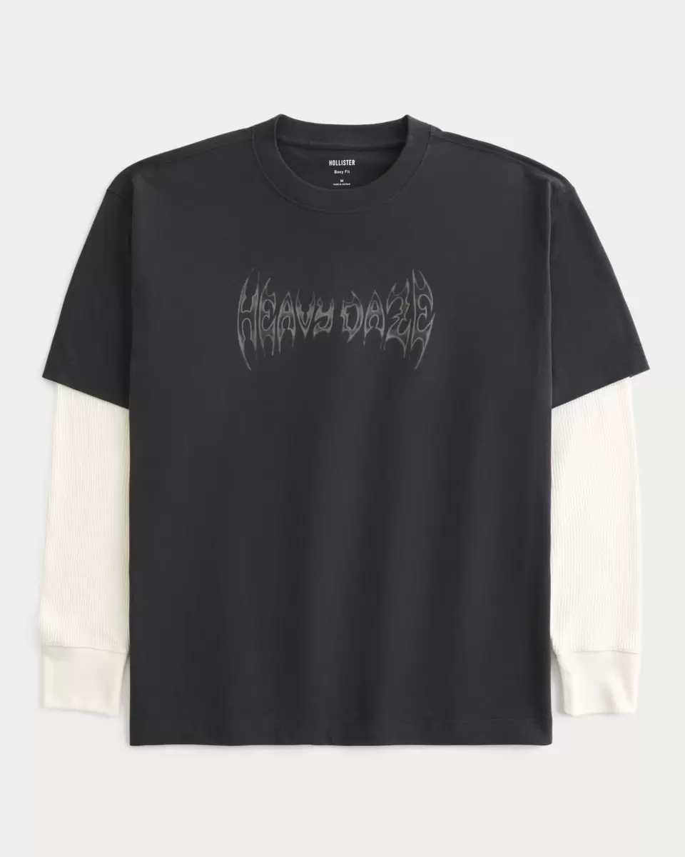 A super soft t-shirt featuring a Y2K-inspired Heavy Daze print graphic and long thermal-fabric sleeves for a layered look. Crew neckline, print graphics at sleeves. Boxy Fit. Imported.