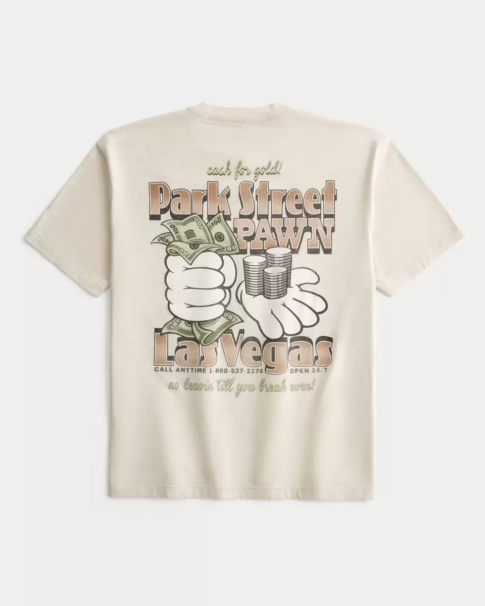 A super soft 100% cotton featuring Park Street Pawn Las Vegas print graphics at the left chest and back. Crew neckline, short sleeves. Boxy Fit.