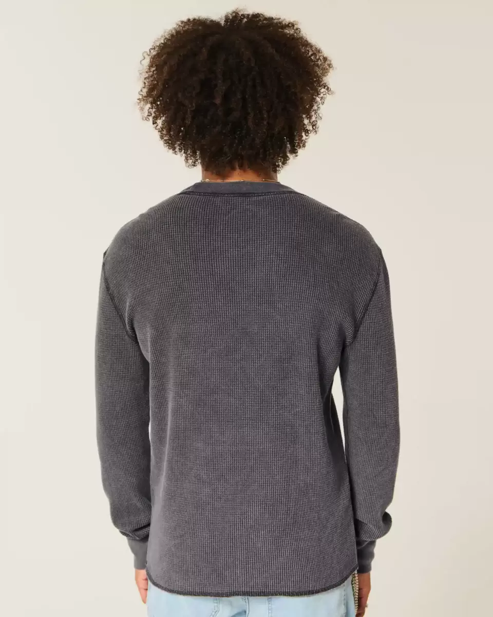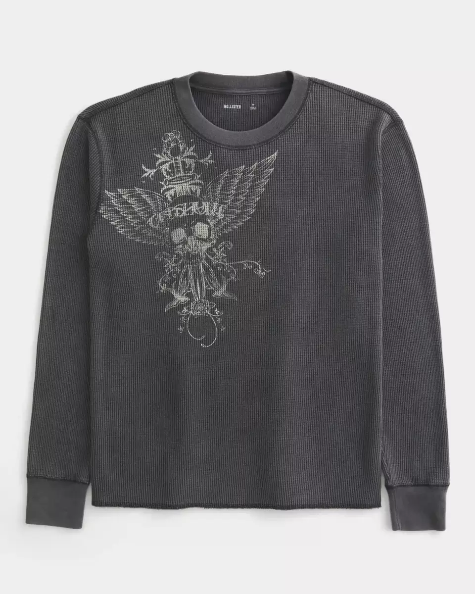 A long-sleeve Y2K-inspired thermal shirt in super soft waffle fabric. Crew neckline, skull with wings print graphic. Imported.