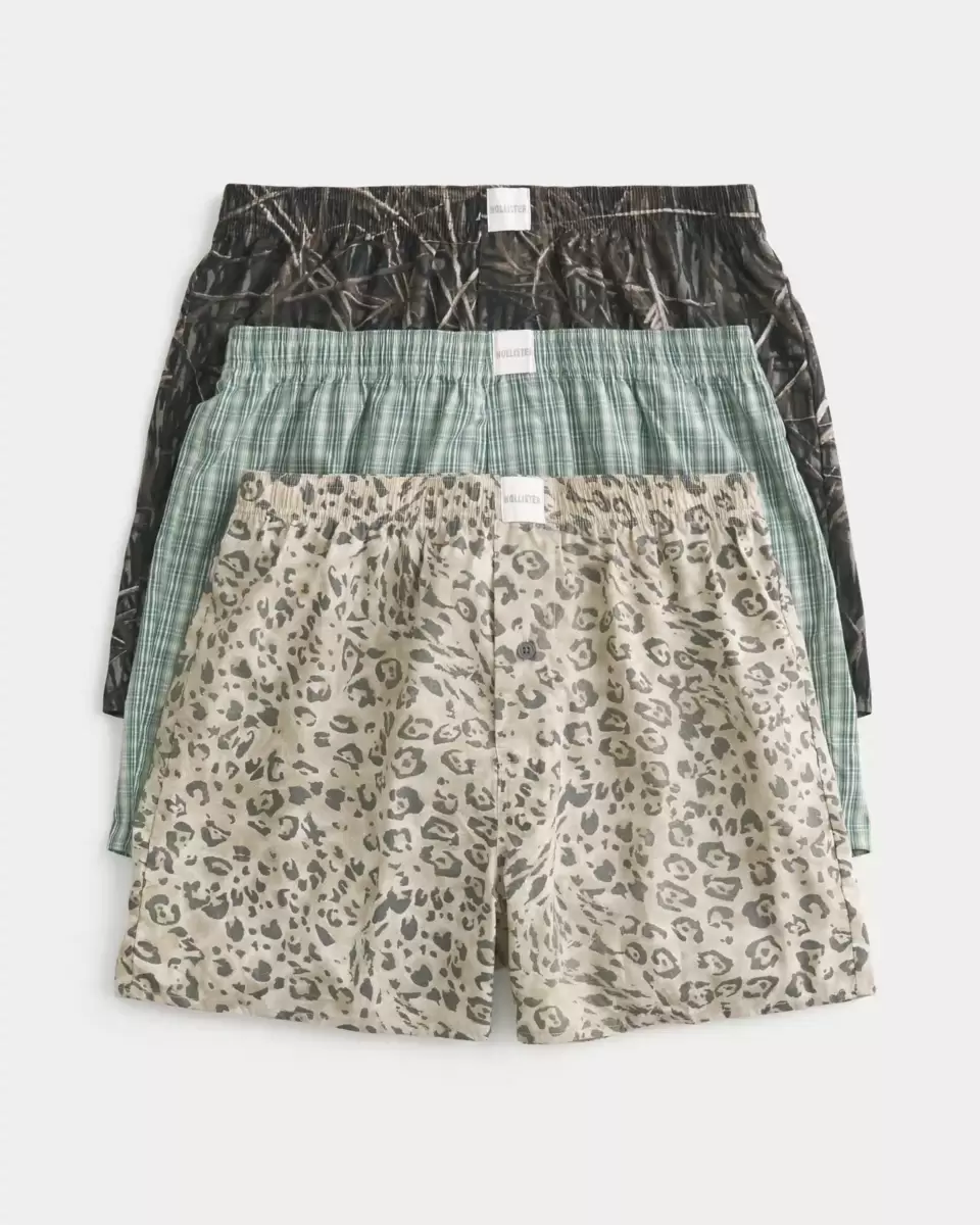 Includes 3 pairs of cotton boxer shorts: leopard print, plaid and camo. Soft waistband, logo tab.