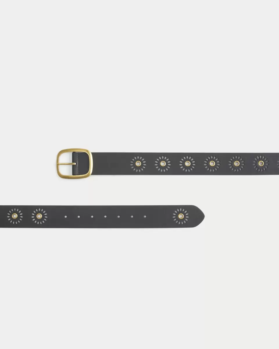 This cute faux leather belt features sunburst details with metal grommets. Metal buckle.
