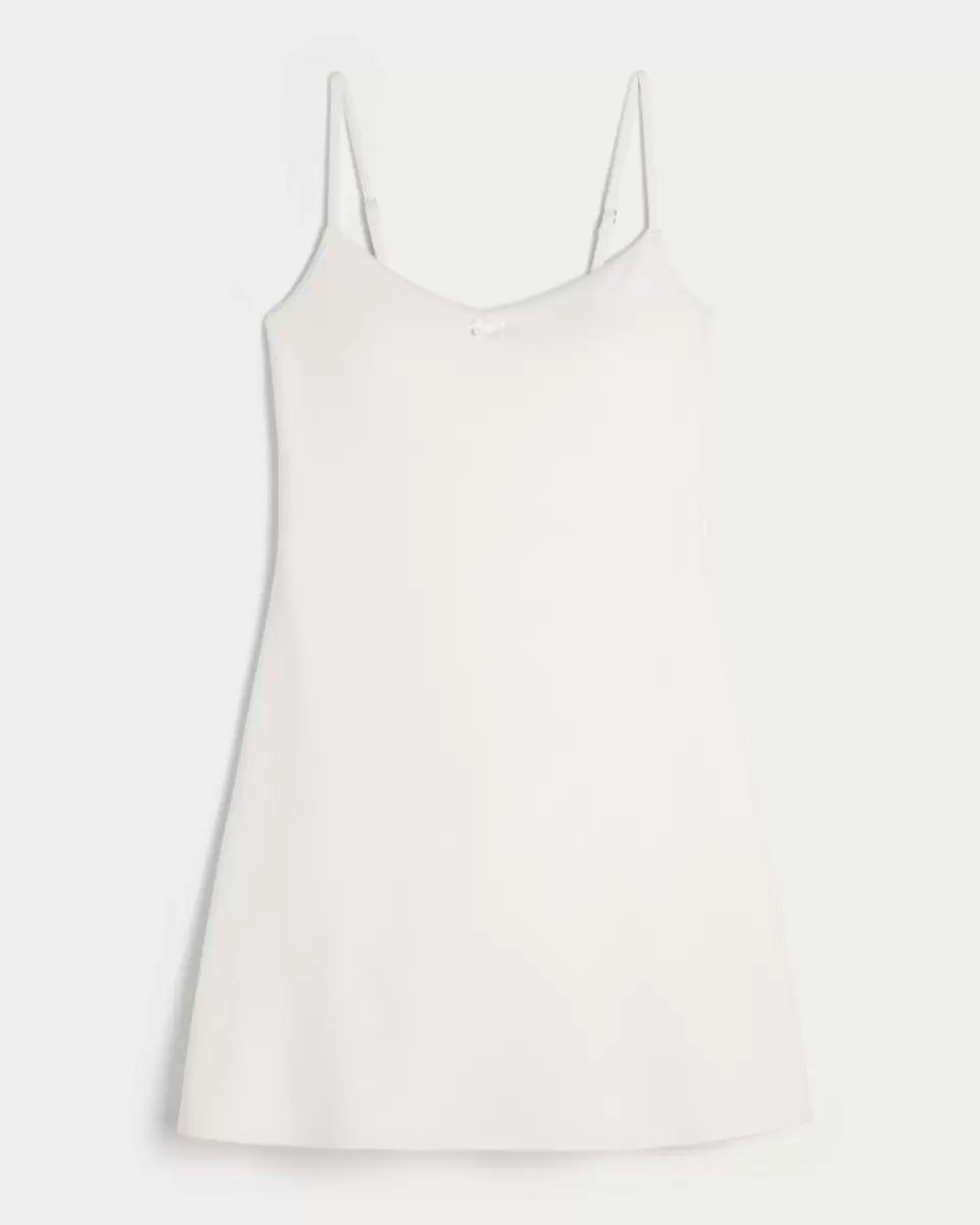 An ultra-comfortable active gameday dress designed in our breathable, 4-way stretch, moisture-wicking Recharge fabric with a super soft, brushed feel. Built-in shelf bra with removable pads, built-in bathroom-friendly shorts with pocket. Cute bow detail at neckline, adjustable straps. Imported.
