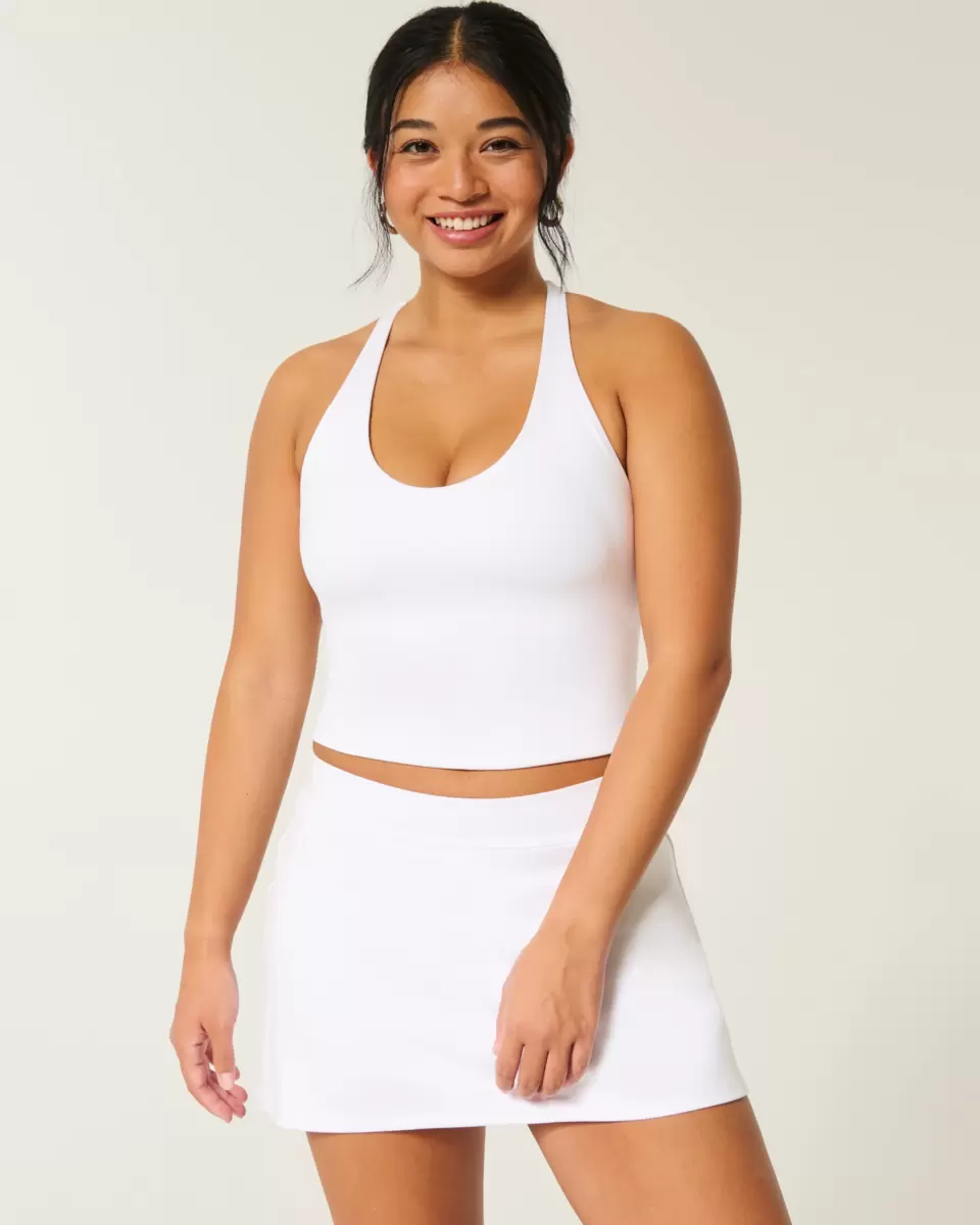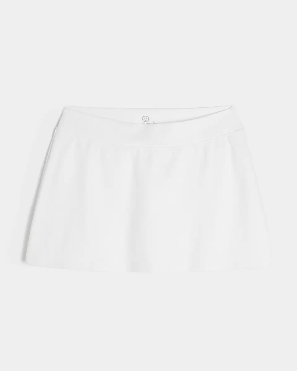 This super comfy skortie is designed in our breathable, 4-way stretch, moisture-wicking Recharge fabric with a super soft, brushed feel. Cute a-line silhouette, built-in shorts with pocket, mid-rise waist. Imported.