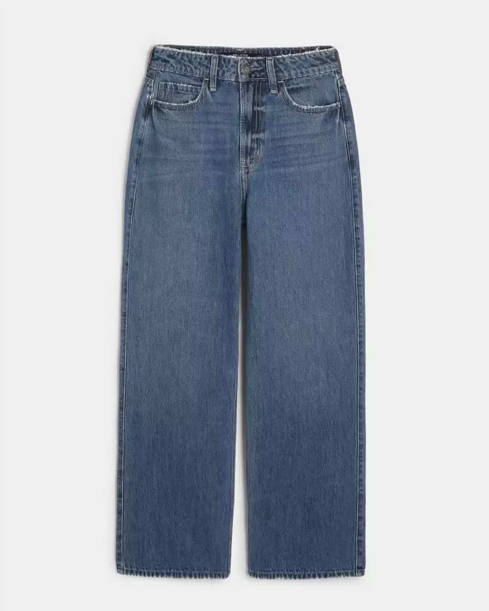 Your new favorite jeans are designed with an ultra high-rise waist and comfortable baggy leg. Medium wash denim with fading and whiskering.