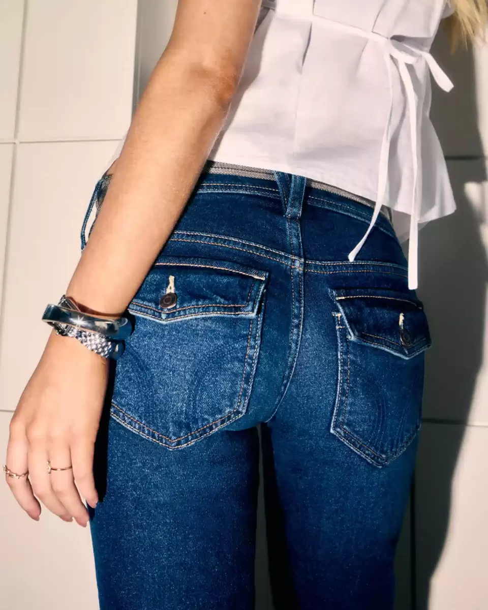 Comfortable denim jeans in a dark wash, designed with a flattering low-rise waist, slim leg and bootcut hem. Vintage Stretch denim, fading. Imported.